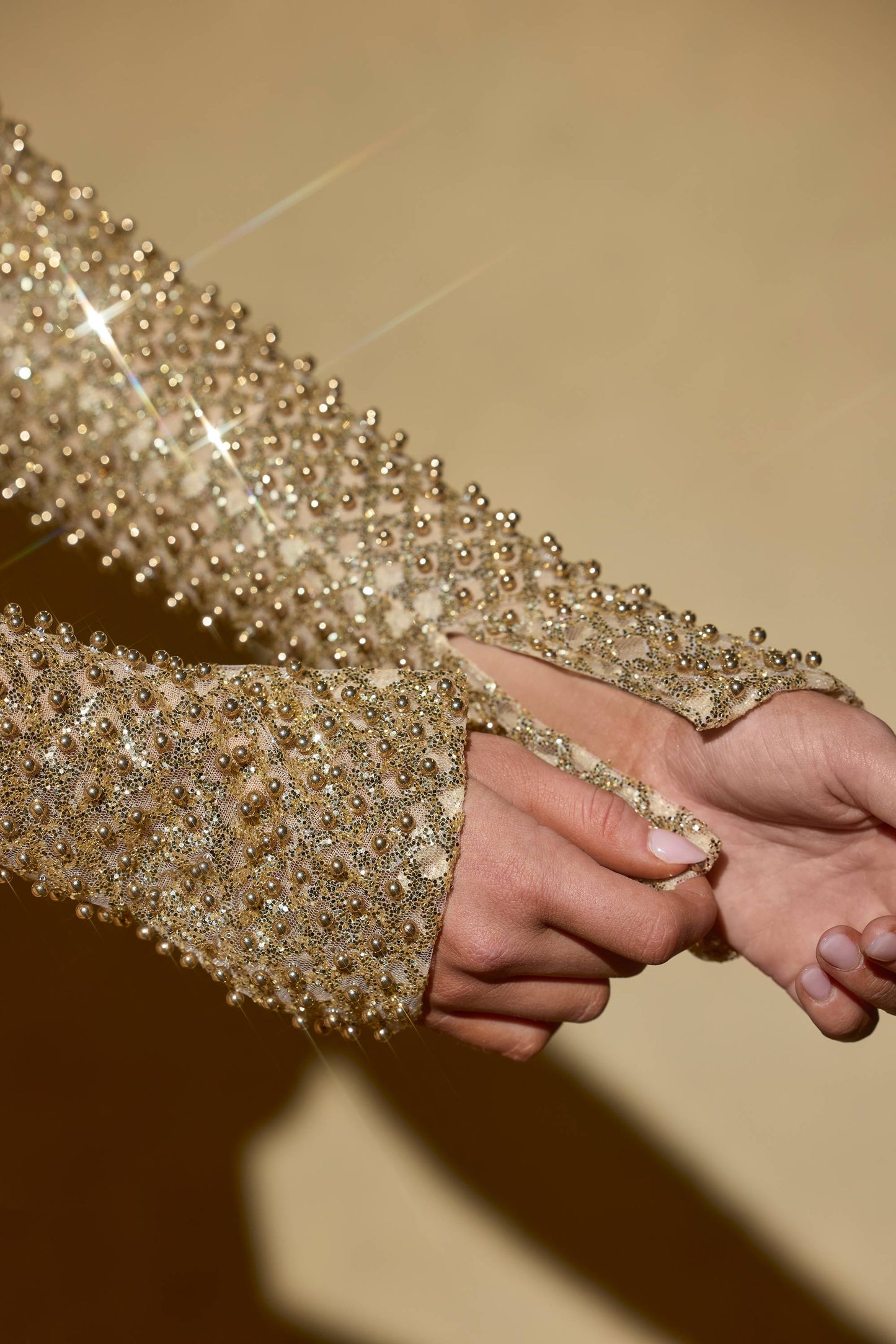 Detachable, adjustable long-sleeve shrug with glitter and bead embellishment