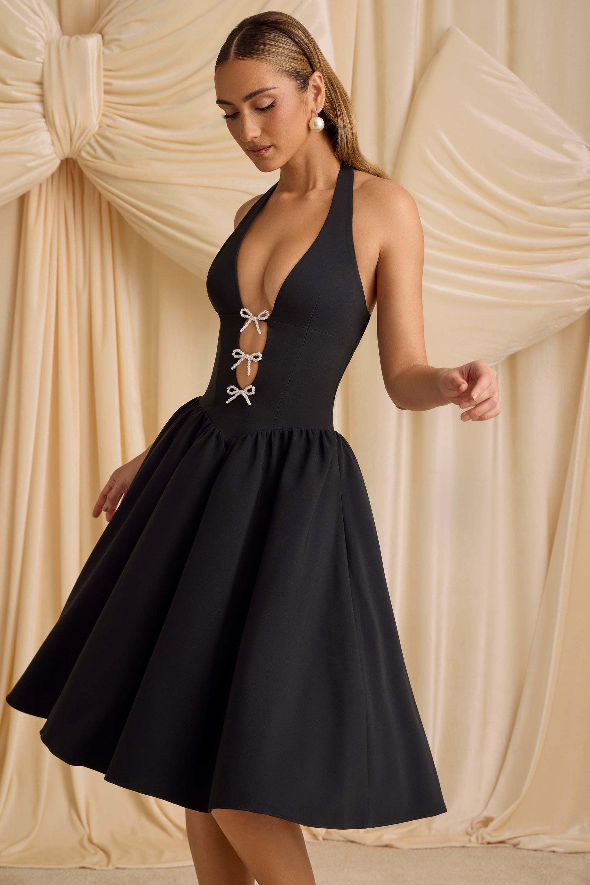 Want to stand out at any celebration? Meet the Angelina midi dress. Crafted from premium stretch woven fabric that hugs every curve, it��s cut to a classic halterneck silhouette with a fitted drop-waist bodice and voluminous gathered skirt. The plunge neckline is traced with a trio of pretty faux-pearl bows for maximum impact at your next event.