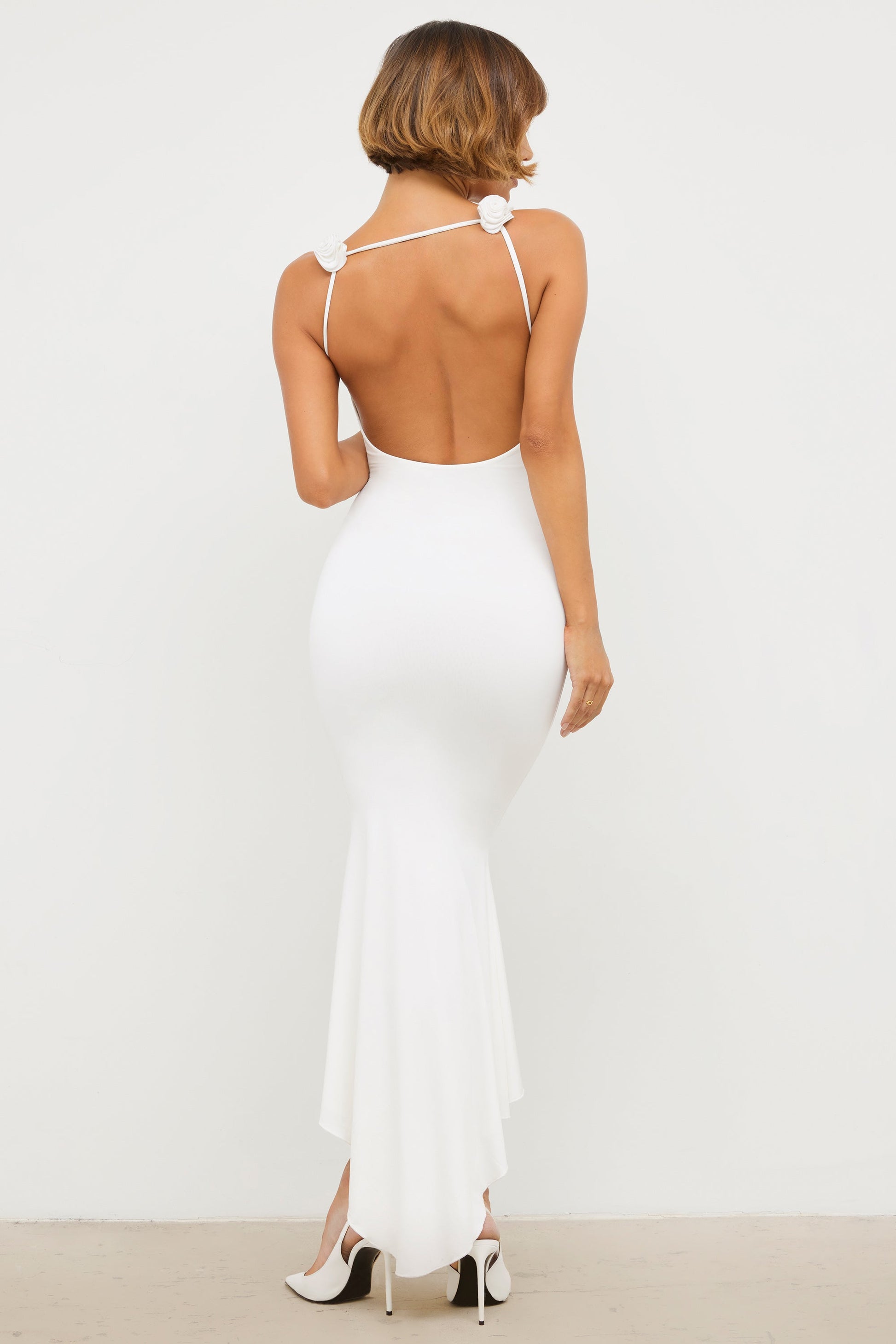 Endless romance. A plunging, cowl-neck midi dress from our Signature Staples collection, designed with a low back, a kick flare hem, and delicate rose detailing at the shoulders. Our premium, slinky jersey fabric is ultra-soft and double-layered, providing a fitted, comfortable feel.