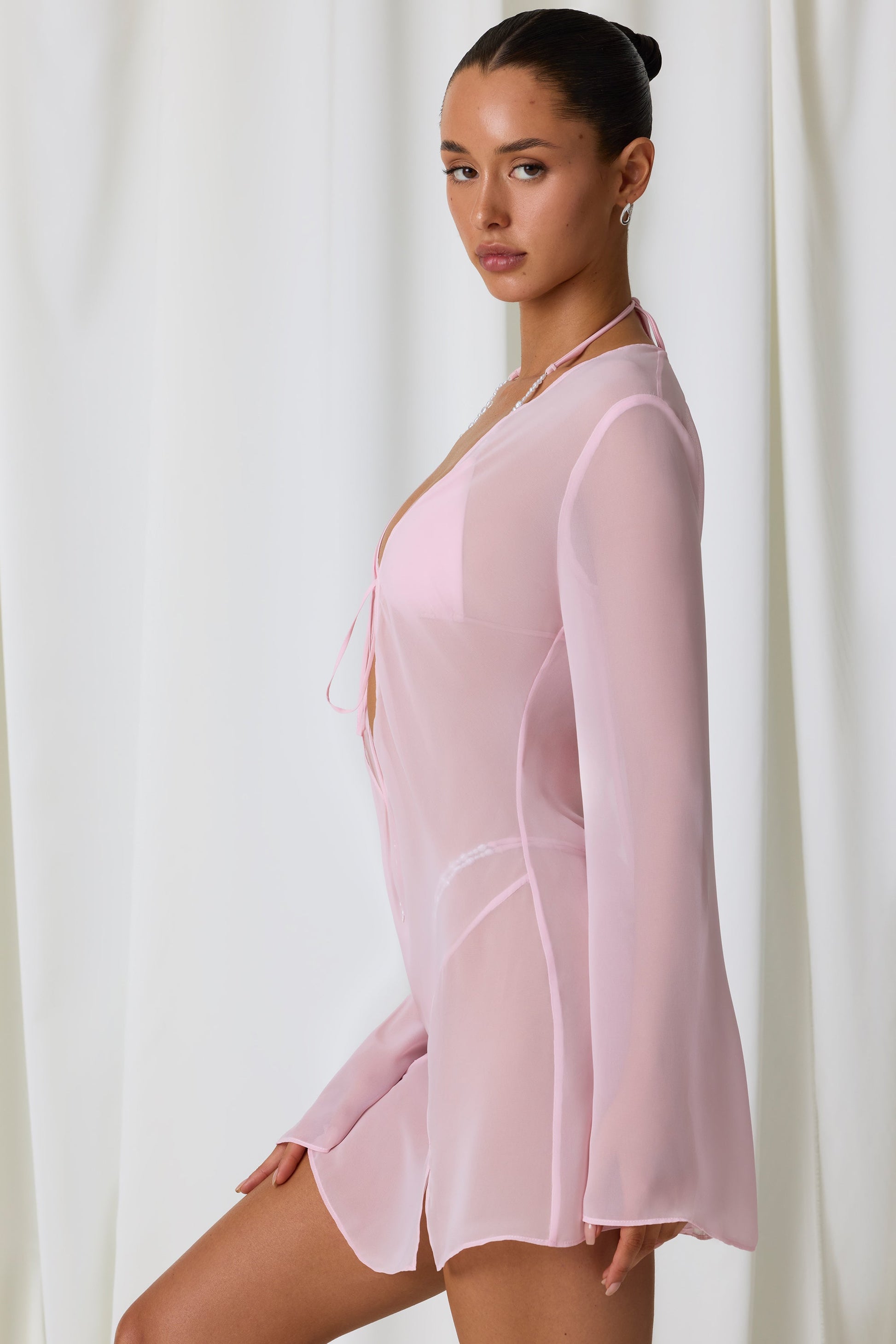 Complete your vacation looks with the Arue micro mini dress. Crafted from sheer, lightweight georgette to spotlight your favourite swimwear, it��s cut to a flirty, plunging cowl-neck silhouette, complete with adjustable ties at the front for custom coverage. It��s framed with long flared sleeves and split detailing at the hem, cementing the breezy beach aesthetic.?