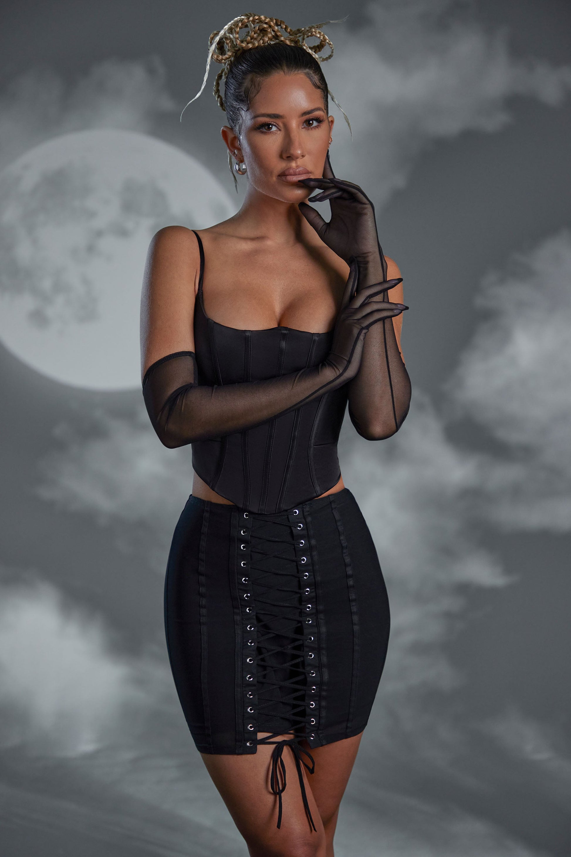 Hug your curves with the Asra mini skirt. Designed in our premium stretch mesh fabric that enhances your silhouette, this glamorous mini skirt features a statement lace up front for seductive, evening styling. Perfect for creating an alluring co-ord, this vintage inspired mini skirt will be a go to style for Halloween and beyond.