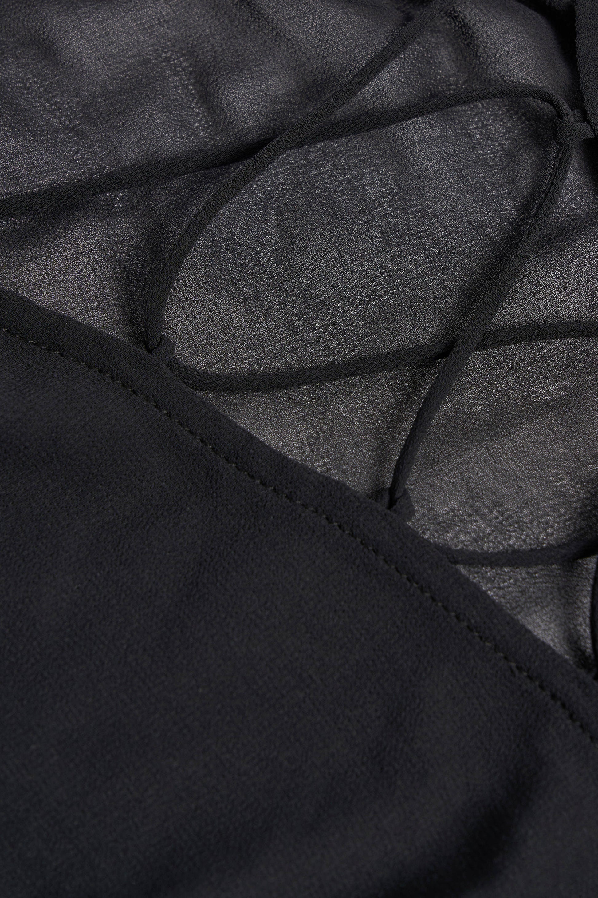 For the dreamers and all-day dancers, the Avalon mini dress is crafted from premium, lightweight georgette. It��s cut to a relaxed silhouette with a semi-sheer loose bodice, framed with oversized balloon sleeves and features a layered mini skirt. It��s complete with a plunge neckline anchored with functional lace-up ties for custom coverage.?