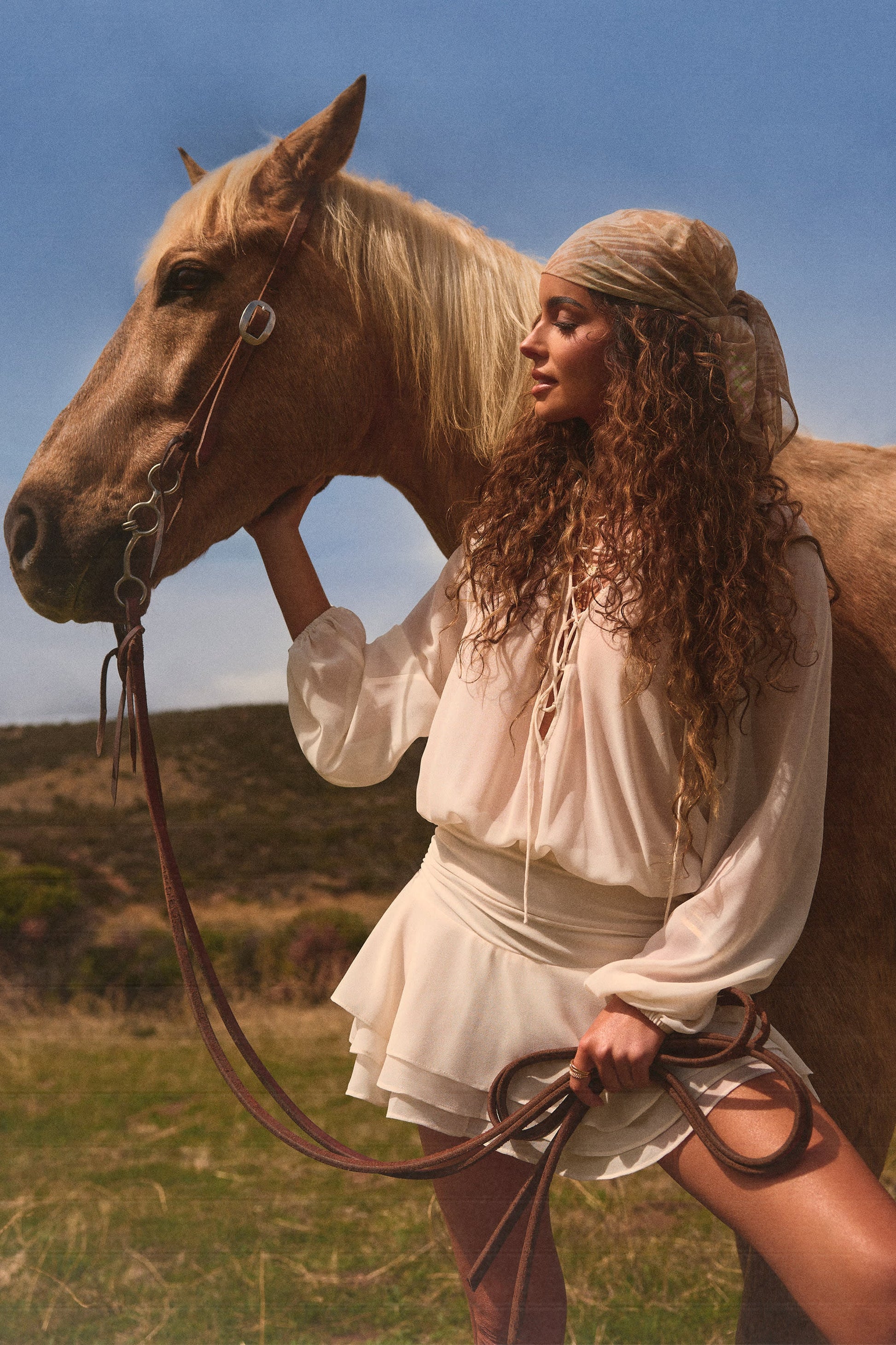 For the dreamers and all-day dancers, the Avalon mini dress is crafted from premium, lightweight georgette. It��s cut to a relaxed silhouette with a semi-sheer loose bodice, framed with oversized balloon sleeves and features a layered mini skirt. It��s complete with a plunge neckline anchored with functional lace-up ties for custom coverage.?