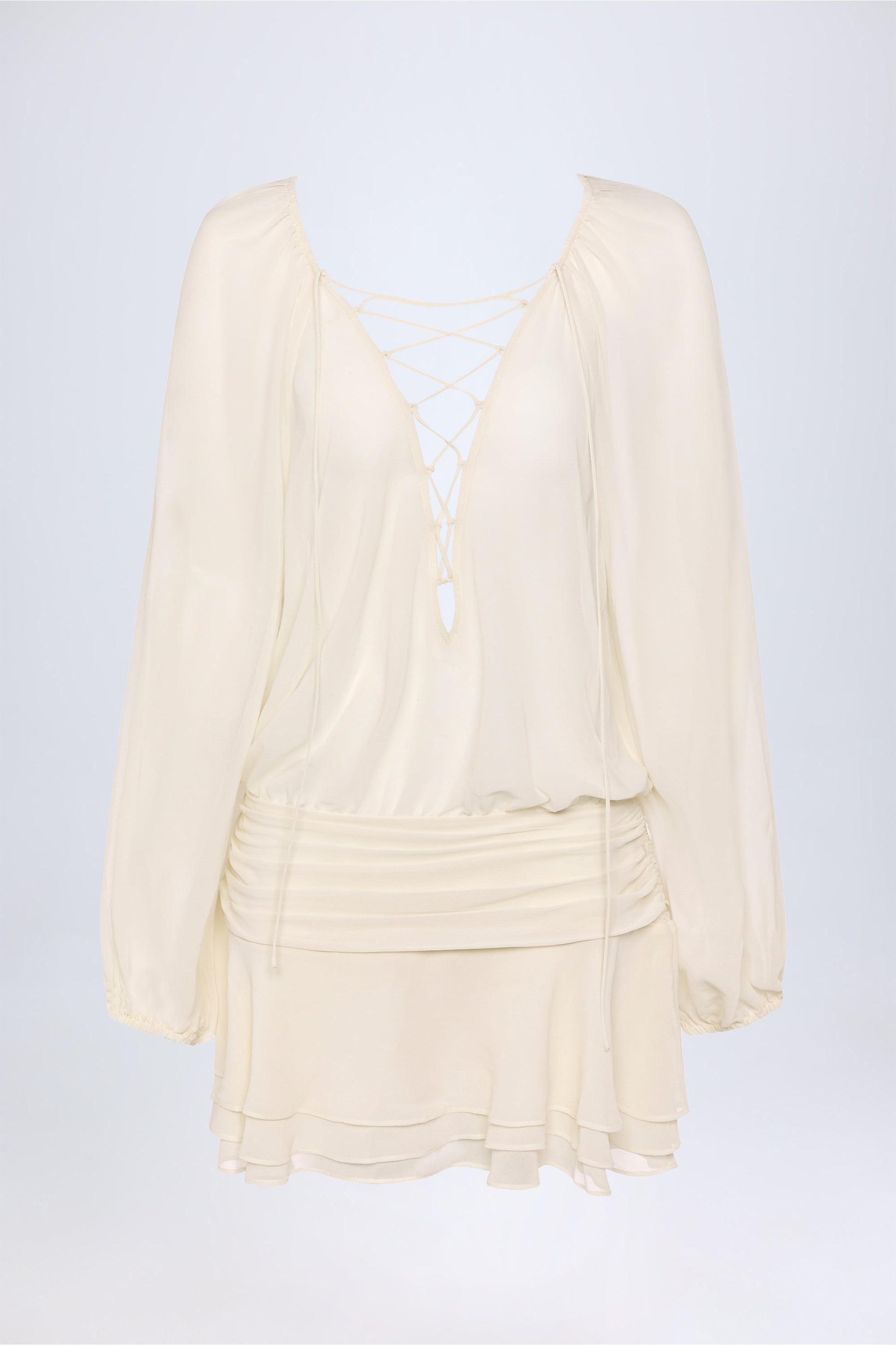 Lace-Up Balloon-Sleeve Mini Dress in Ivory