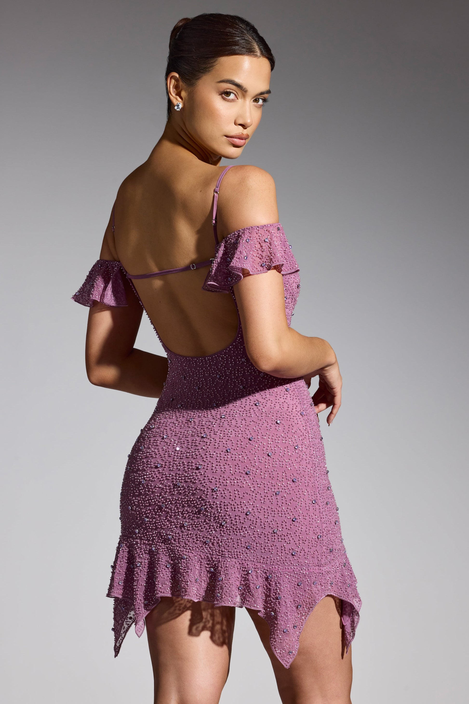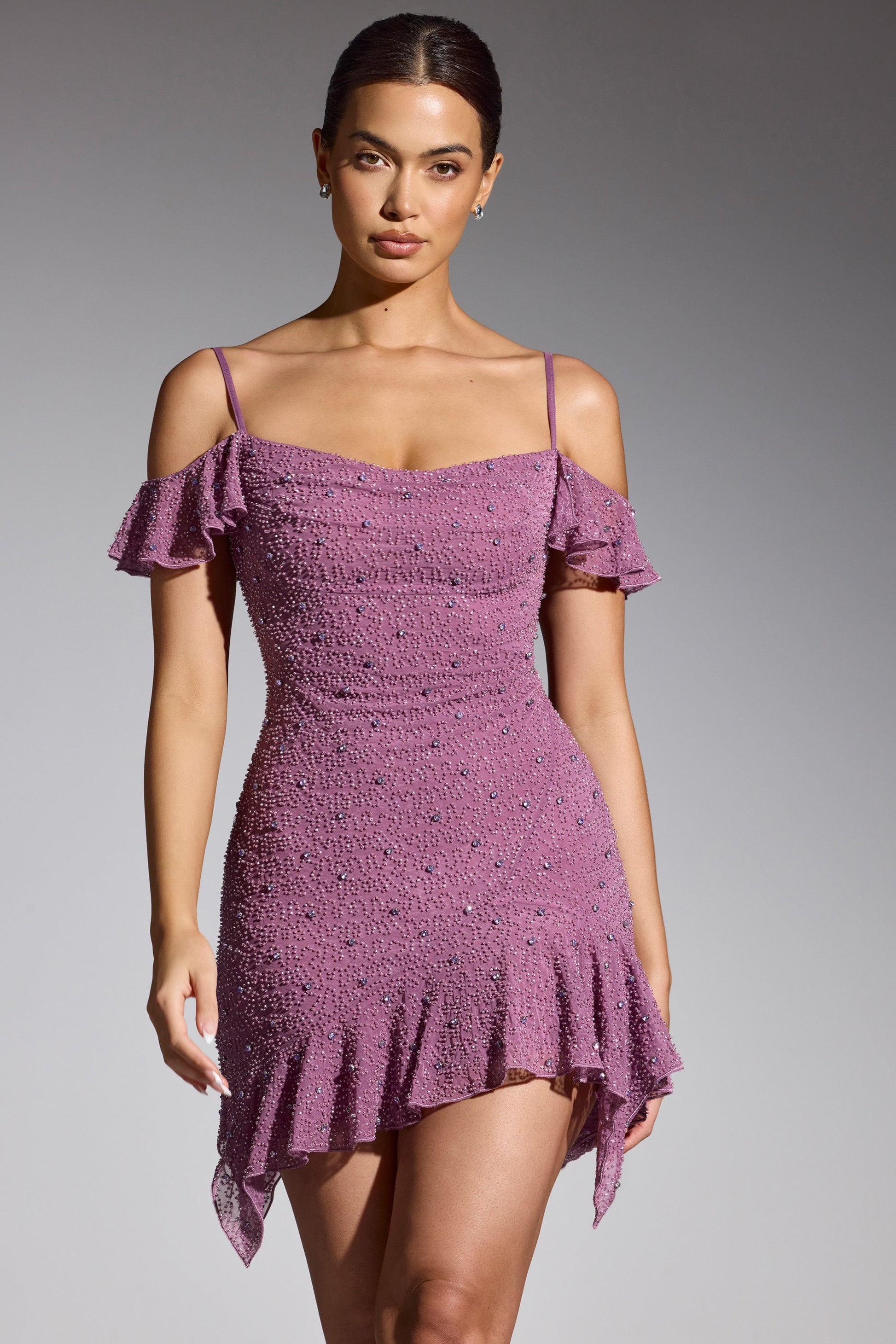 Embellished Cold Shoulder Mini Dress in Grape