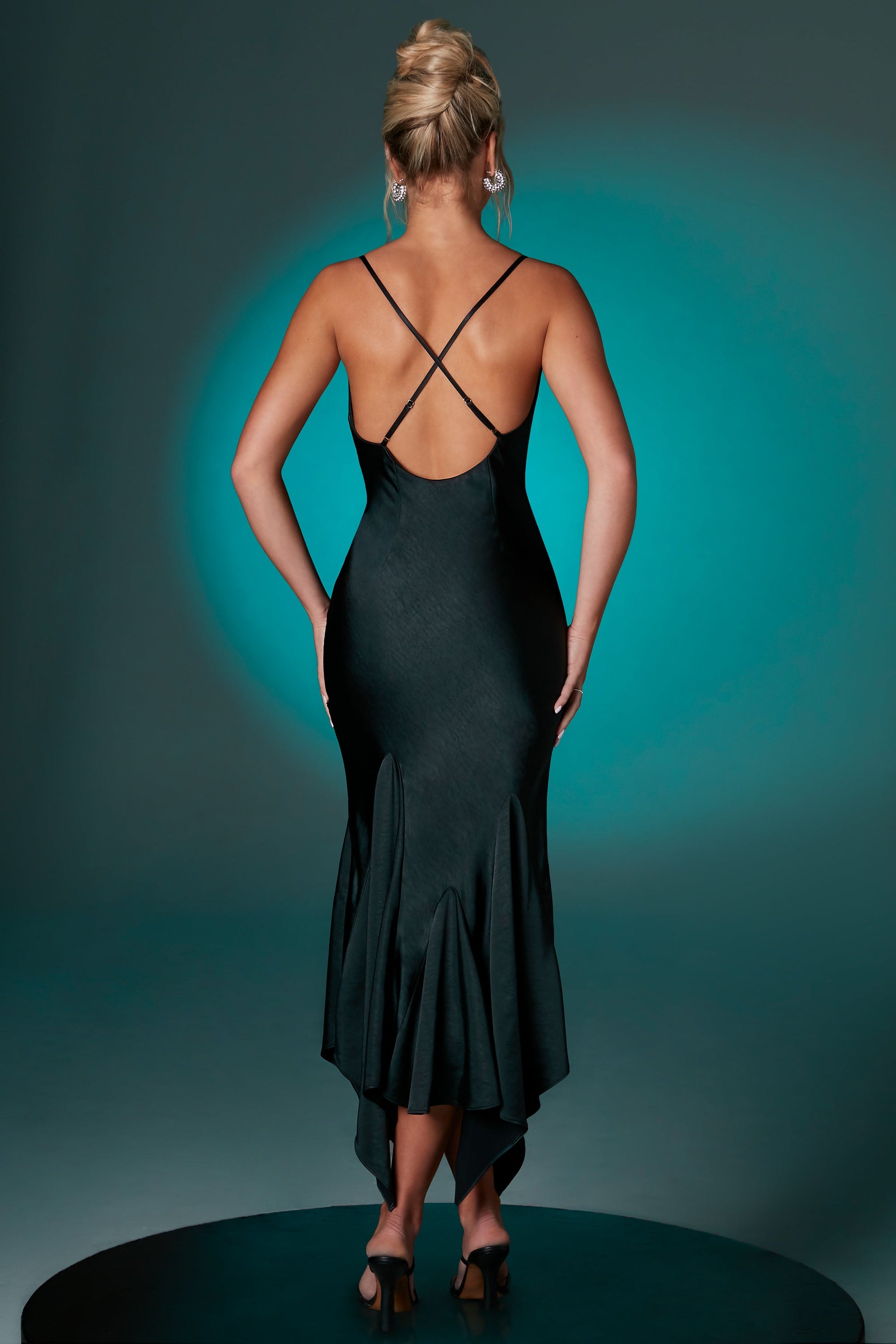 Party season requires statement evening dressing and the Blair maxi dress has everything you need to be center of attention this season. Designed in our premium heavy satin fabric in two on trend colourways, Blair features a bust flattering cowl neckline with seductive low back with cross strap detailing that ensures attention from every corner of the room. Falling to a dramatic maxi length with an asymmetric hemline complete with elegant pleated ruffles, this sexy midaxi is a showstopper designed to ensure you look and feel amazing this party season.