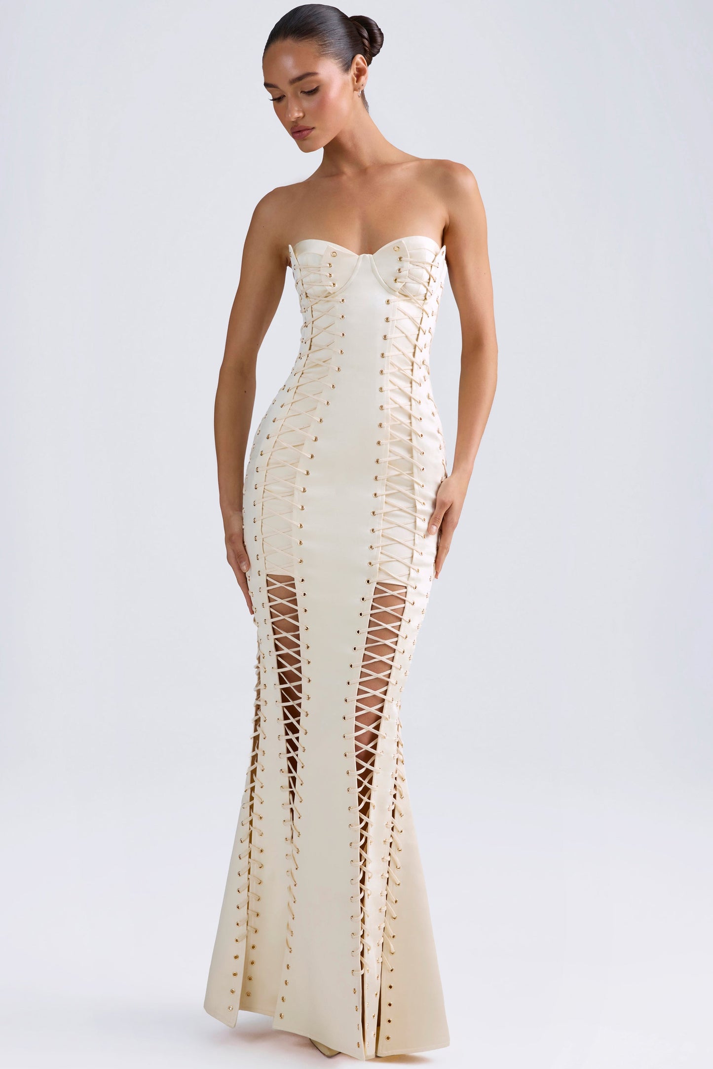 Meet the Callidora gown: a head-turning silhouette designed for special occasions, traced with striking lace-up and cut-out detailing at the front. Imagined in two hues and modelled on classic corsetry, it��s crafted from lustrous heavyweight satin with a power mesh underlay and anchored with a shaping built-in bodice. It��s complete with contoured cups for enhanced support and falls to a floor-skimming fishtail skirt.