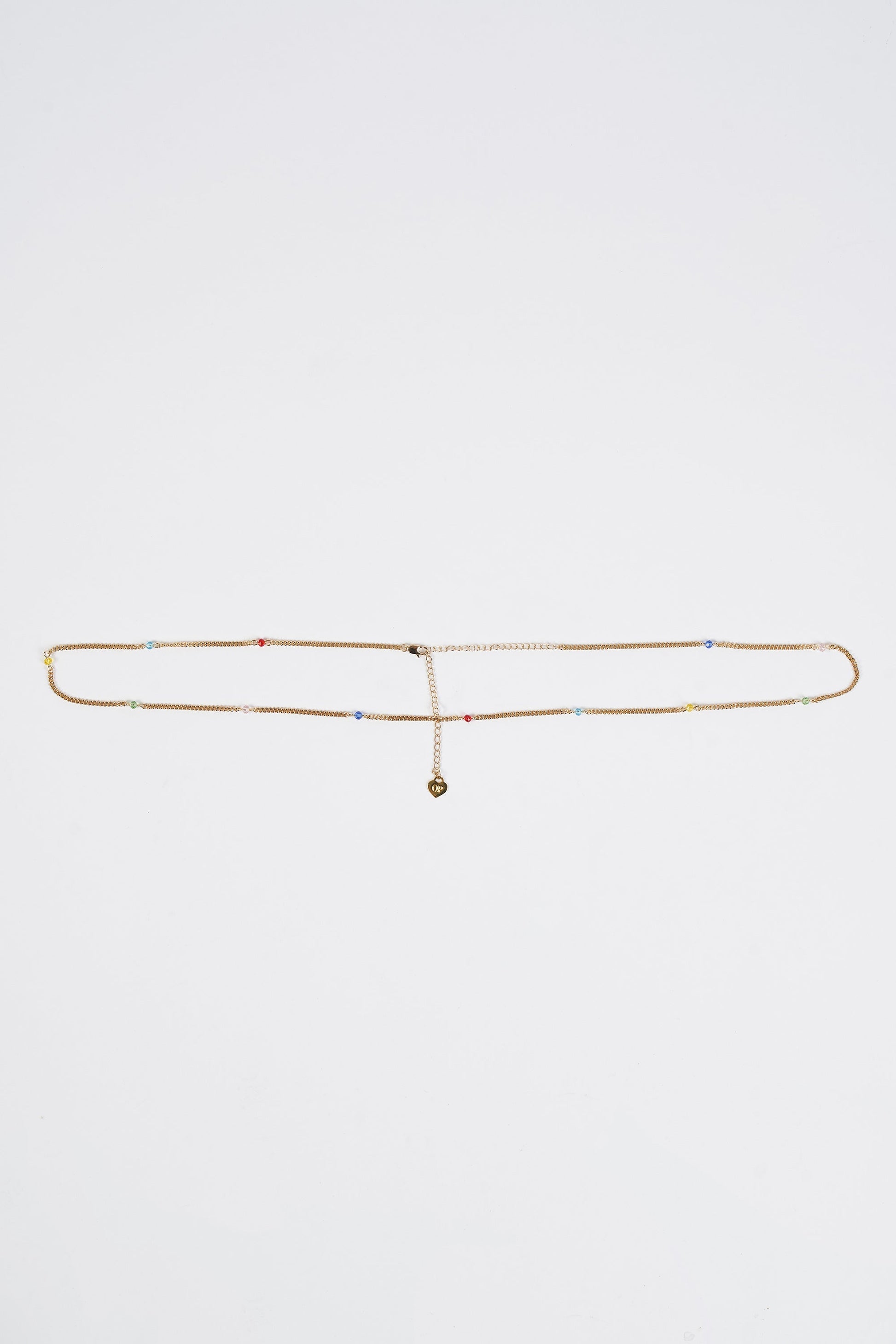 A statement finishing touch. Ideal for adding a touch of glamour to beach club looks, this waist chain is crafted from gold-tone metal with chunky curb links and punctuated with faceted crystal embellishments that add a pop of colour. It comes in a soft-touch branded pouch for safekeeping and easy packing.