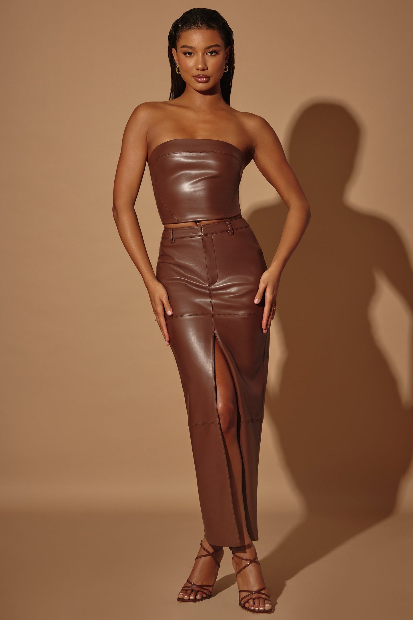 Mid-Rise Vegan Leather Maxi Skirt in Brown