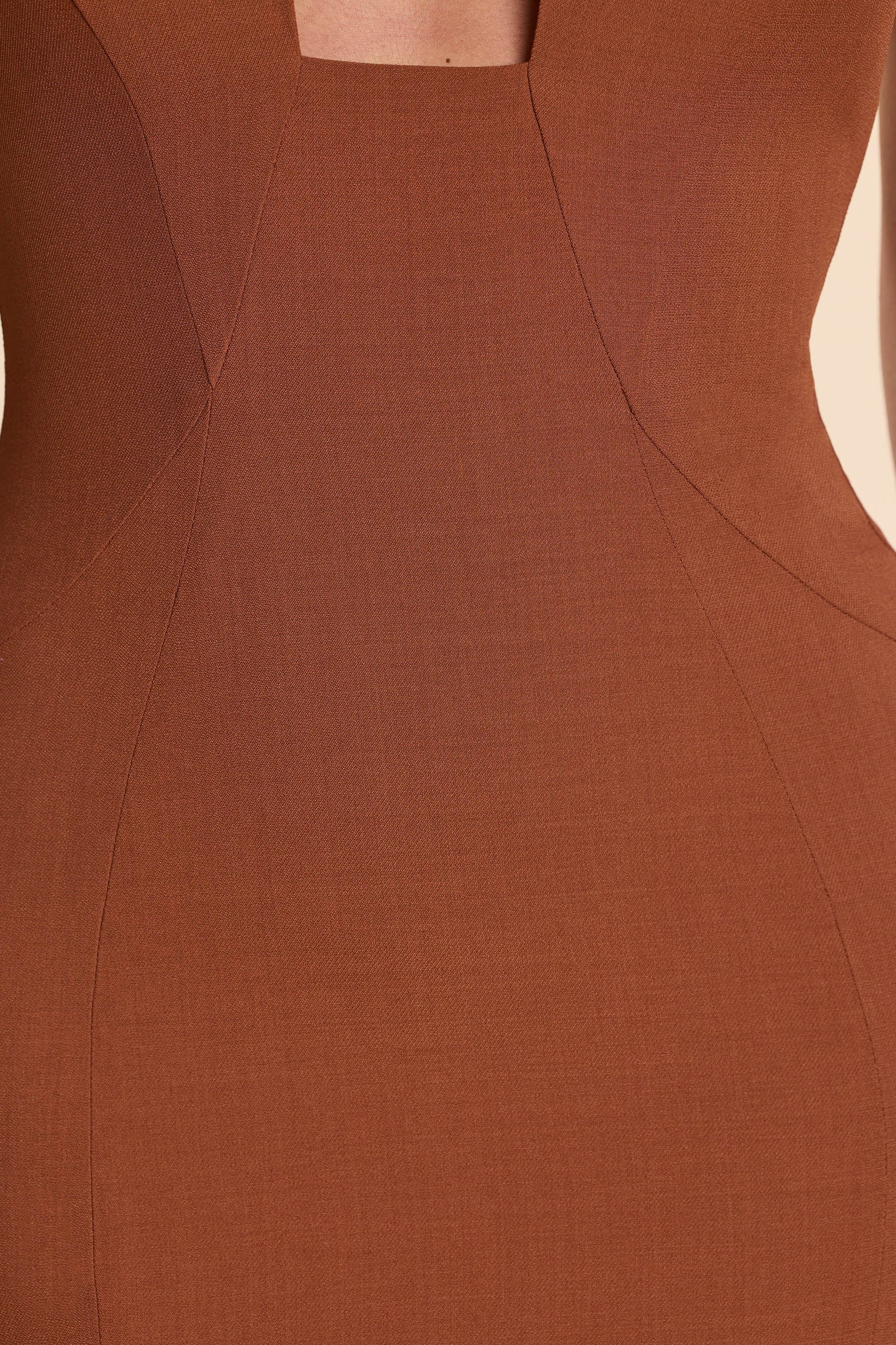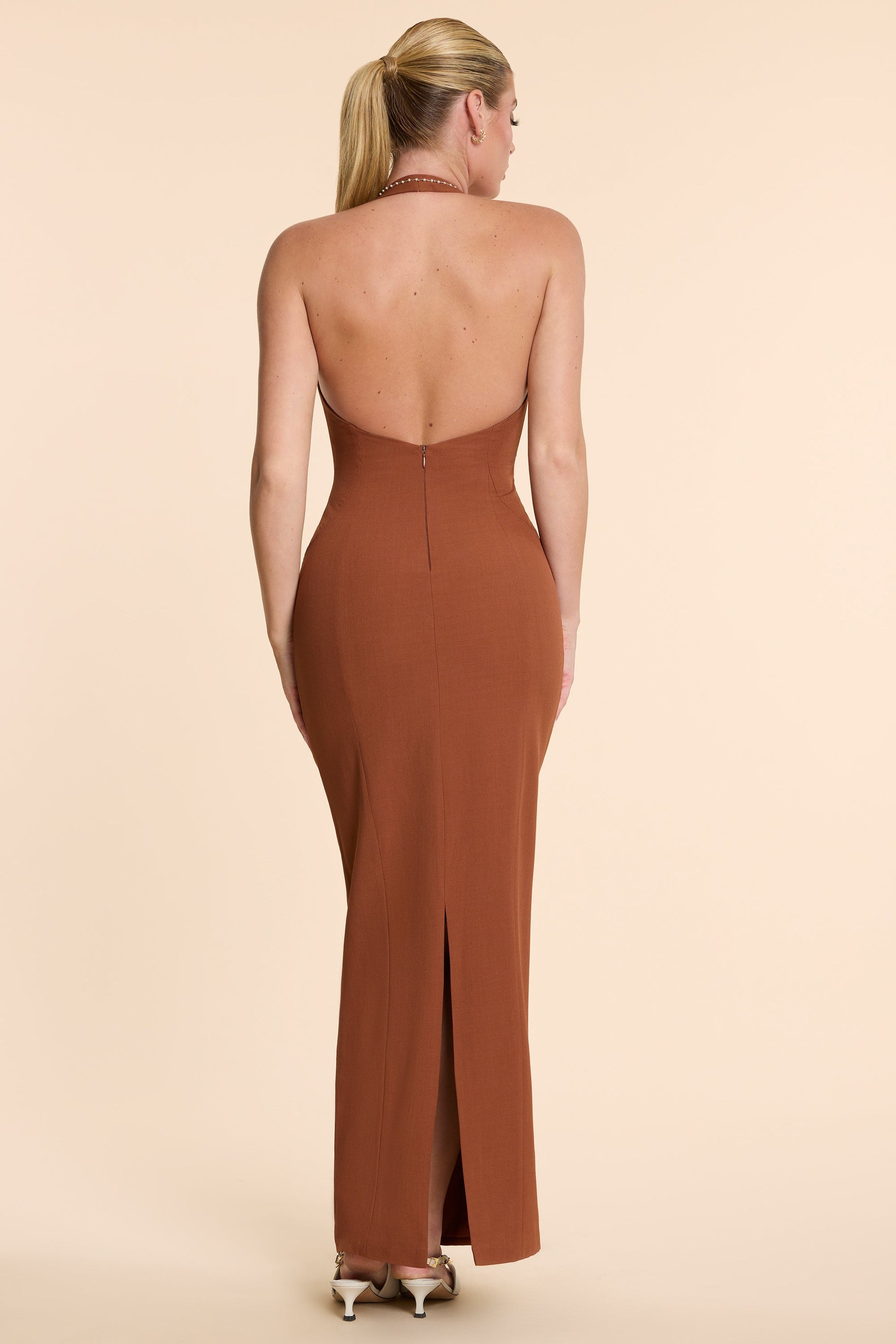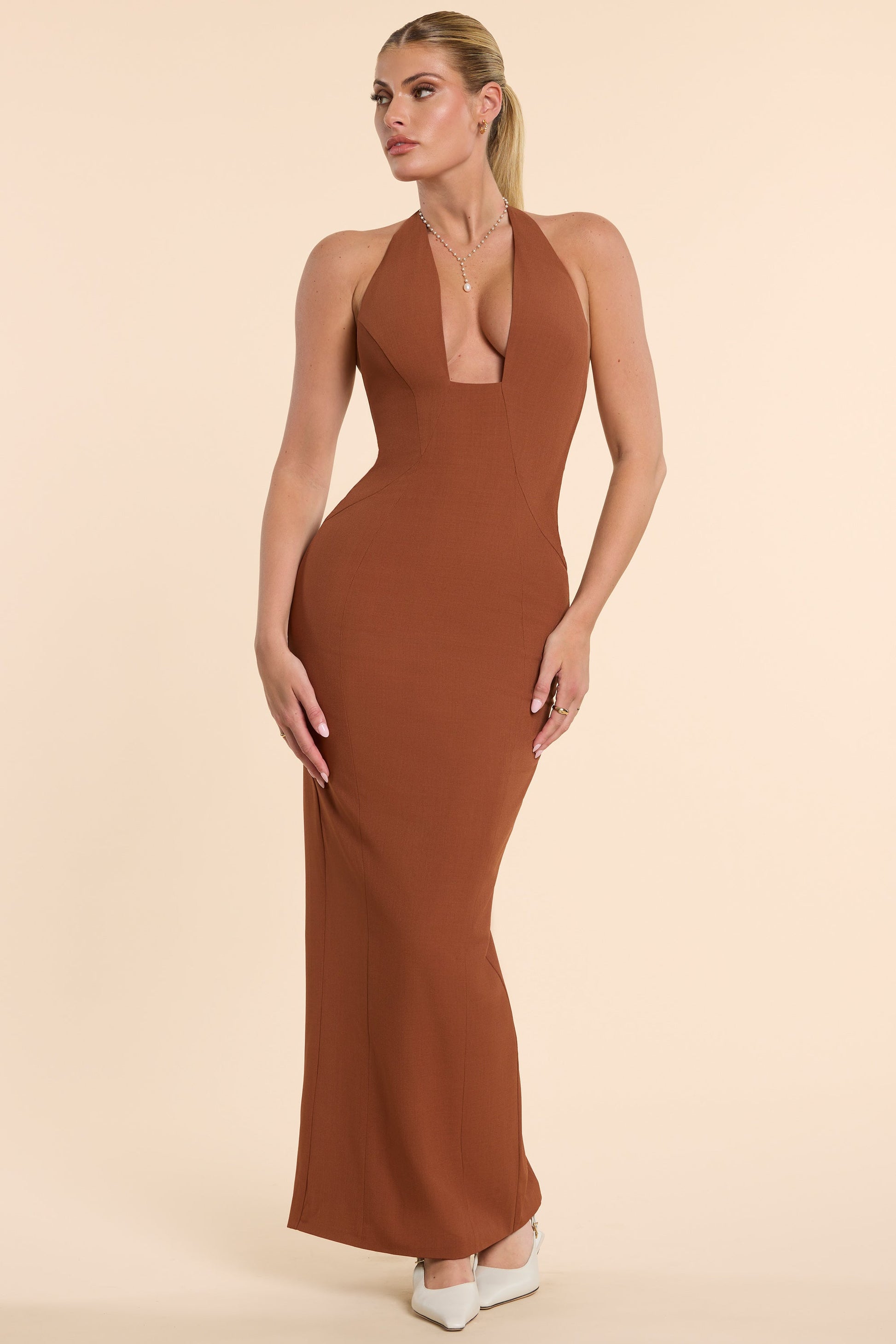 Woven Twill Halter Neck Plunge Maxi Dress in Chestnut Brown