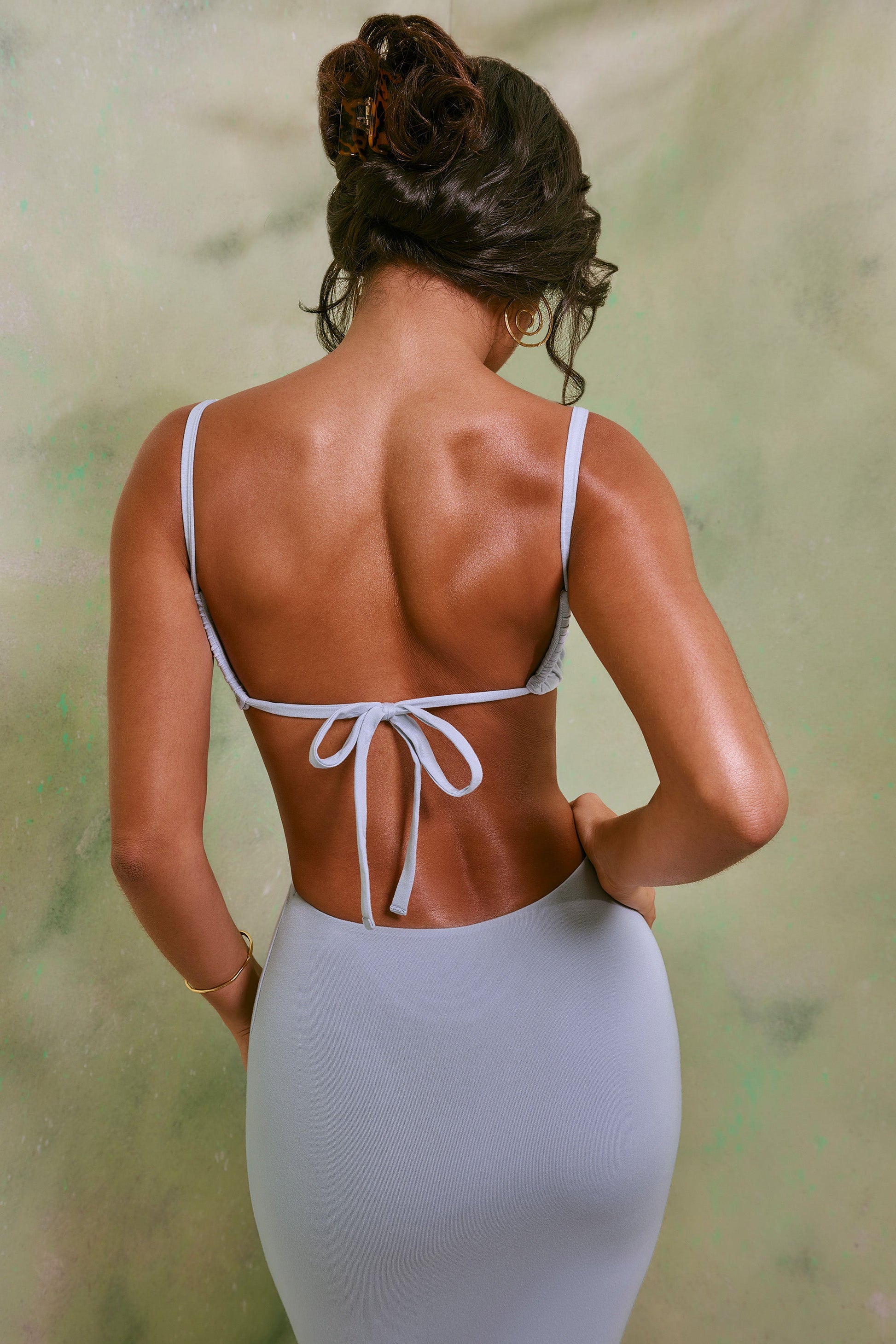 Enhance your body with the Demetria midi dress, a sleek and sexy design created to smooth your silhouette and maximize seduction. Made from our body contouring modal fabrication, the Demetria midi dress features a bust flattering scoop neckline with functional ruched channel that fastens at the back. Side cut outs with cohesive ruched detailing work to create the illusion of a narrowed waist and continue through to the undeniably sexy open back. Cut to a midi length, the Demetria midi dress is complete with a narrow slit at the back that allows for ease of movement.