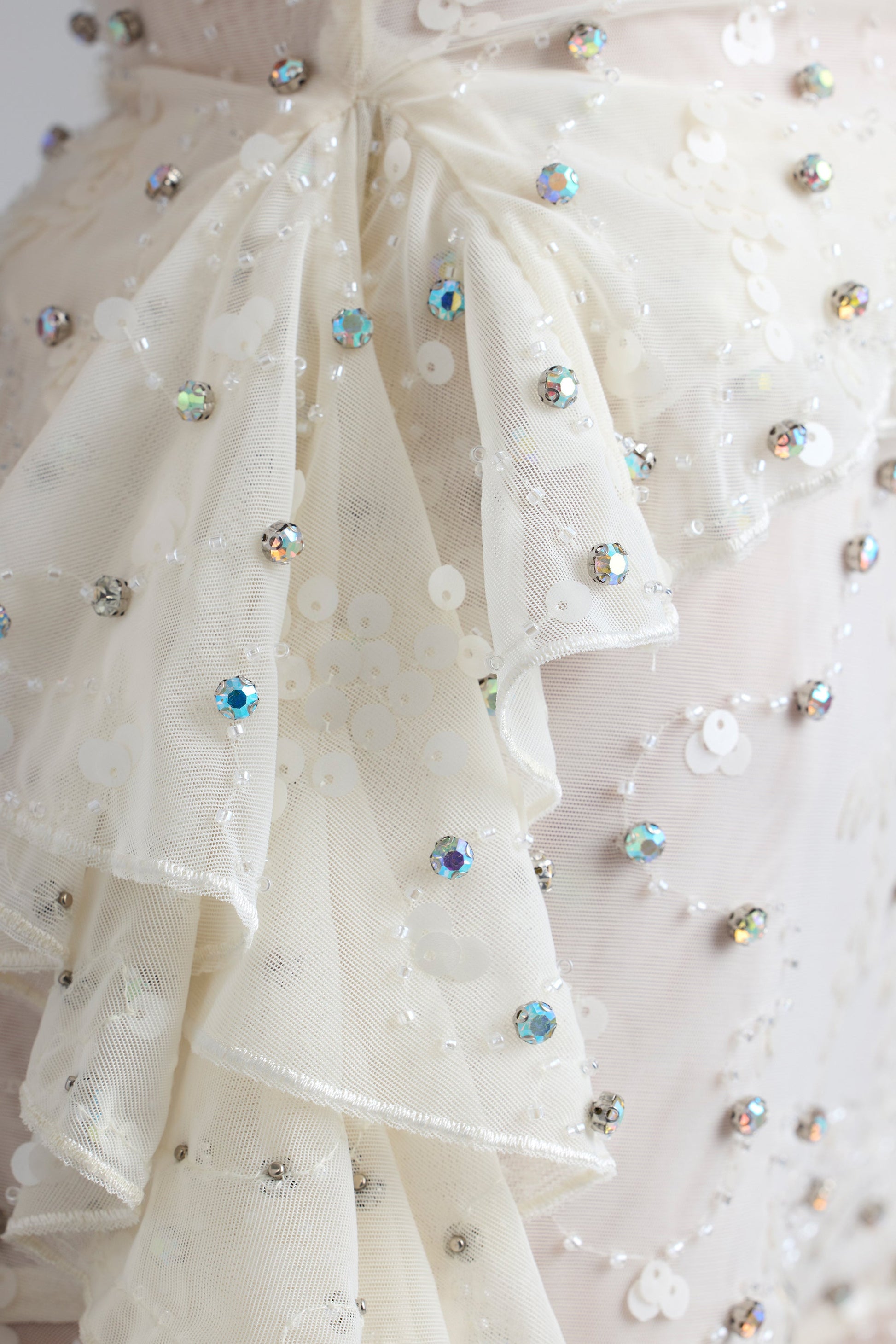Noughties-inspired silhouettes with a whimsical twist. Fully embellished with gleaming crystals and sequins, the Demi top is ideal for creating dreamy festival looks. It��s crafted from our premium 20D mesh fabric to an asymmetric silhouette with a cascading ruffle trim, perfectly placed ruching and off-shoulder long sleeves. The bandeau neckline is secured with concealed internal silicone tape.