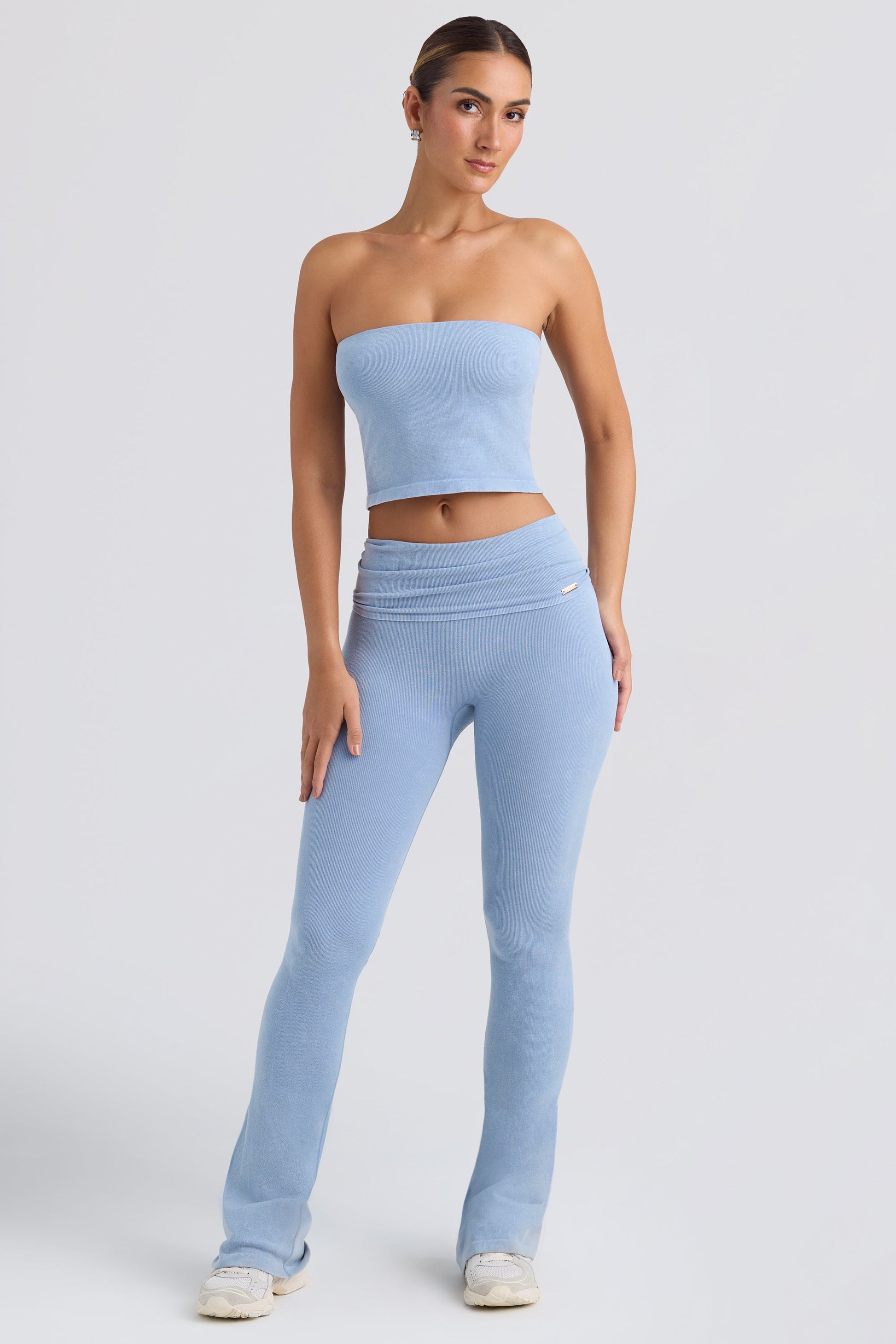 Foldover Flared Trousers in Washed Blue