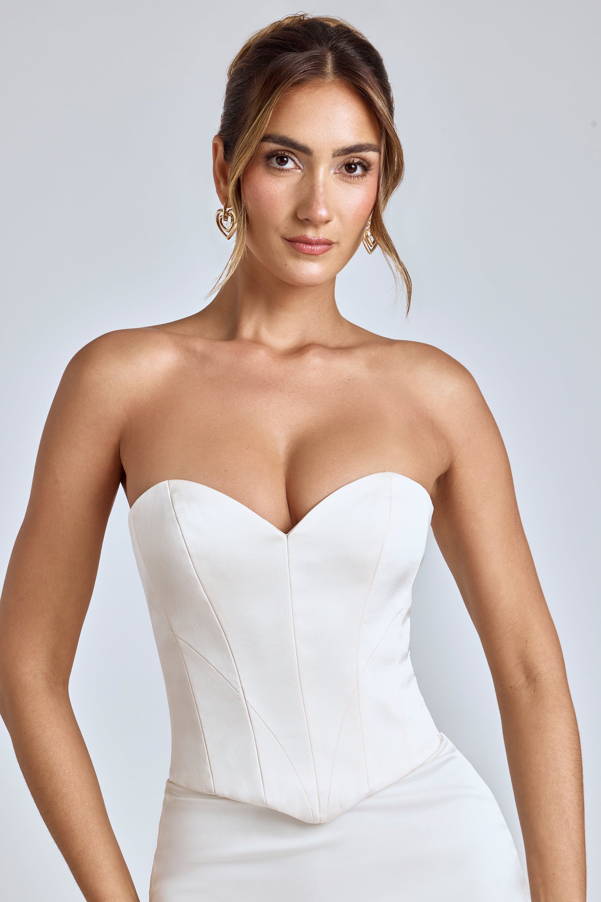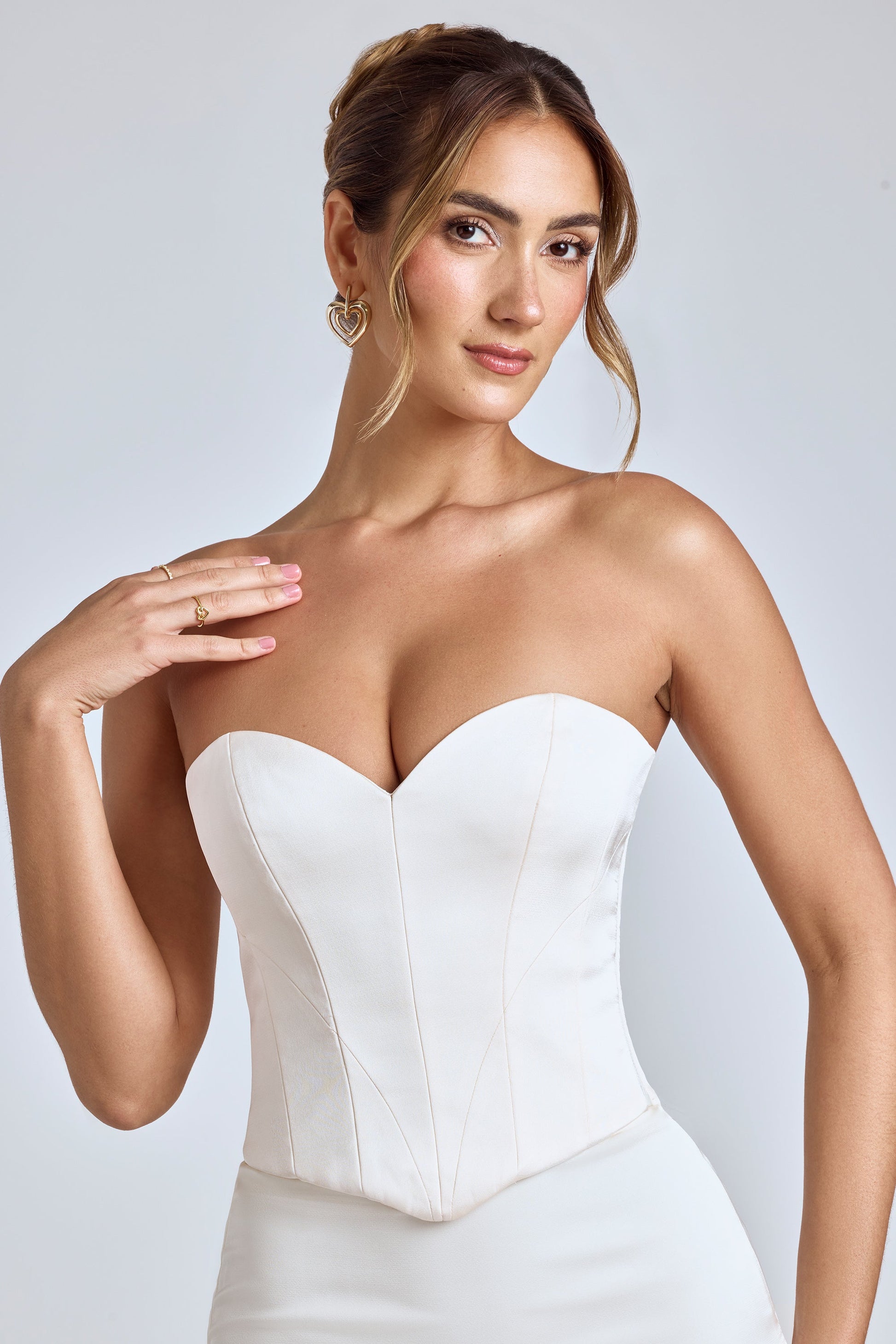 Elevated separates. Designed in our premium satin fabric, the Effie top is a strapless design with a bust-flattering sweetheart neckline. Built-in corsetry works to cinch your figure, while cut-out detailing at the back ensures eyes on you from every corner of the room.
