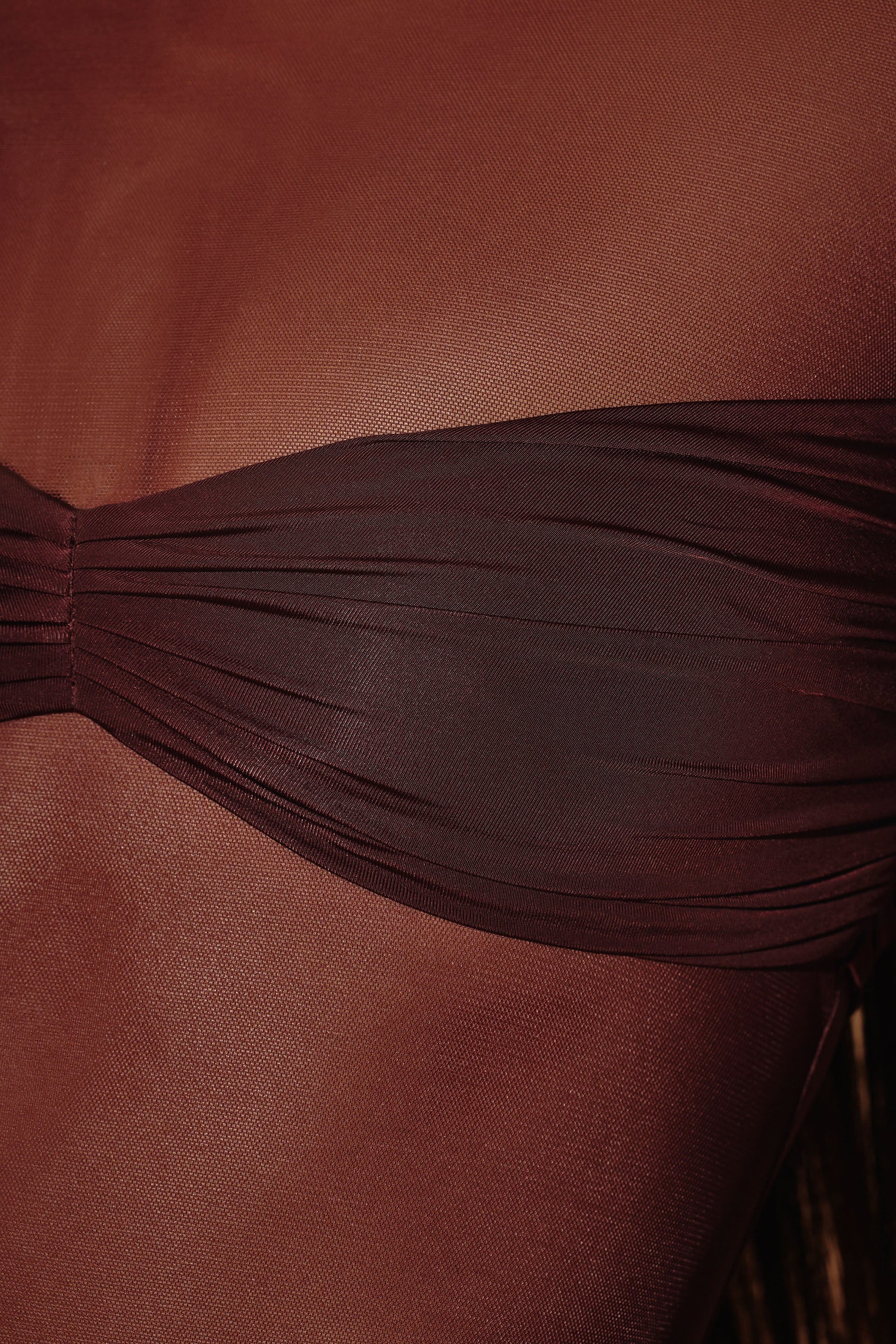 Sheer Panelled Long Sleeve Mini Dress in Brown