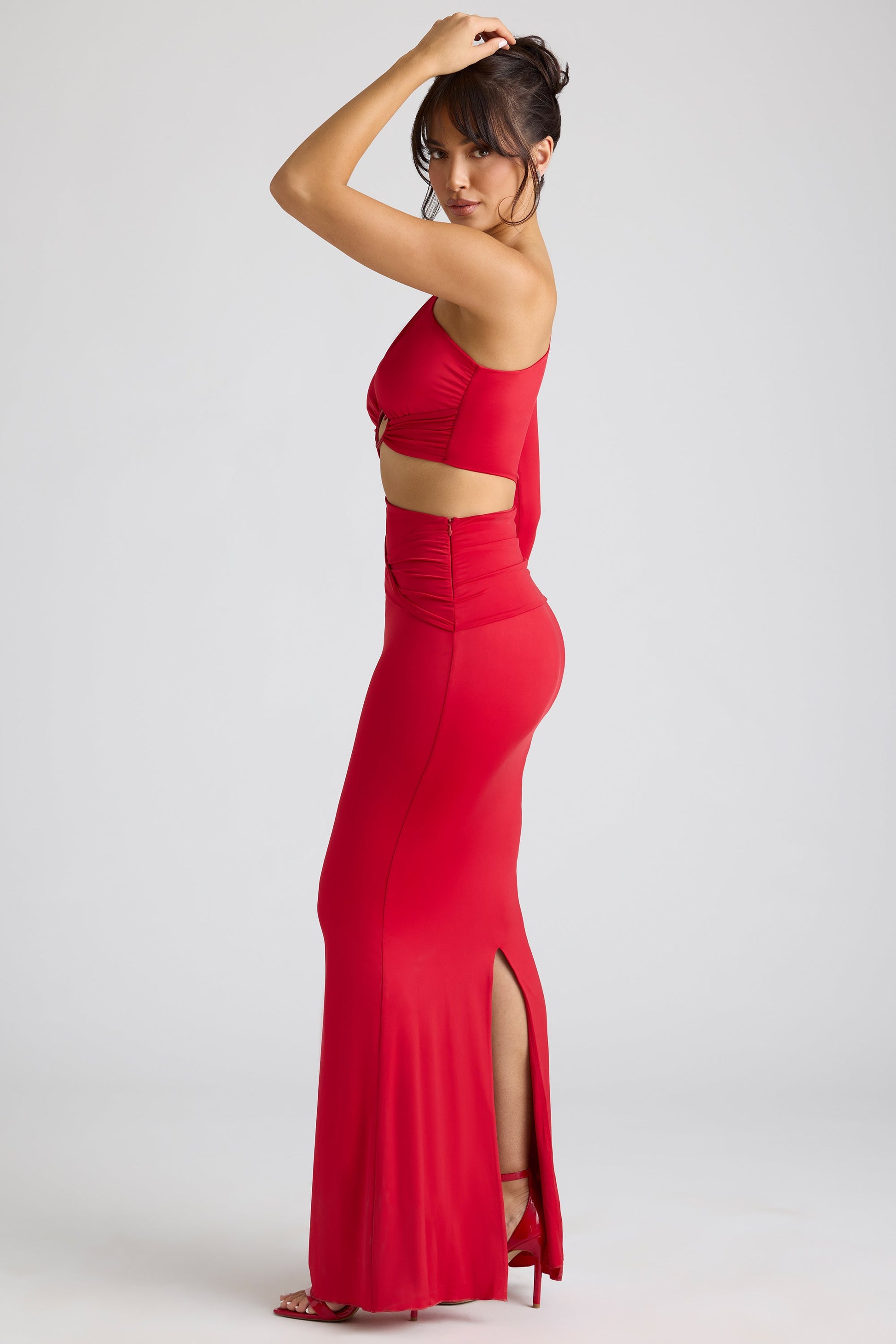 Single Sleeve Cut Out Evening Gown in Fire Red
