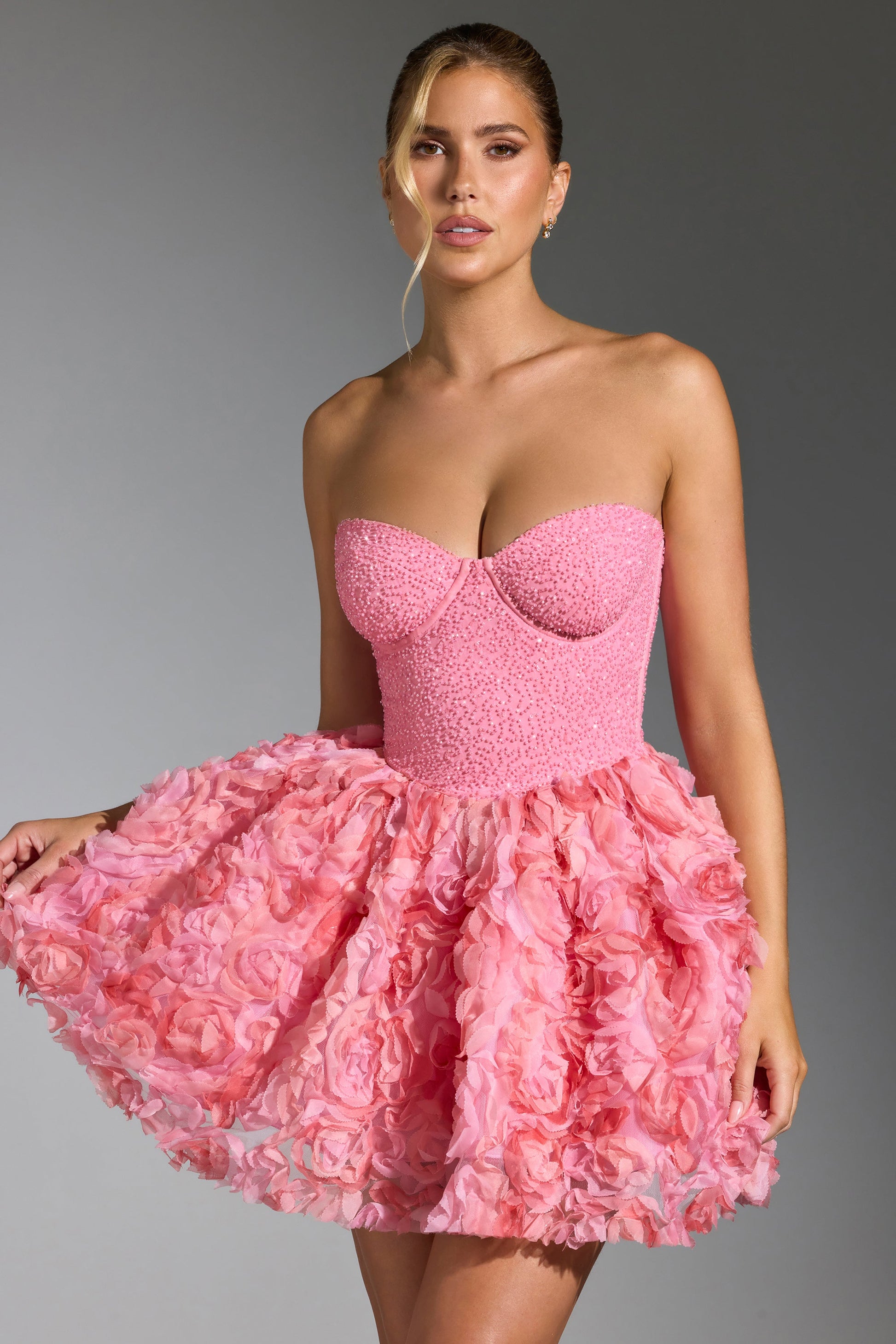 Ethereal elements meet classic corsetry with the Evanthe mini dress. A one-of-a-kind piece that��s designed to attract all eyes your way, it features a fully embellished boned bodice and falls to a frothy A-line mini skirt adorned with custom-made tulle rosettes: each one is lovingly hand-applied to create a striking three-dimensional finish. The sweetheart neckline is anchored by delicate detachable straps, allowing you to create multiple looks.