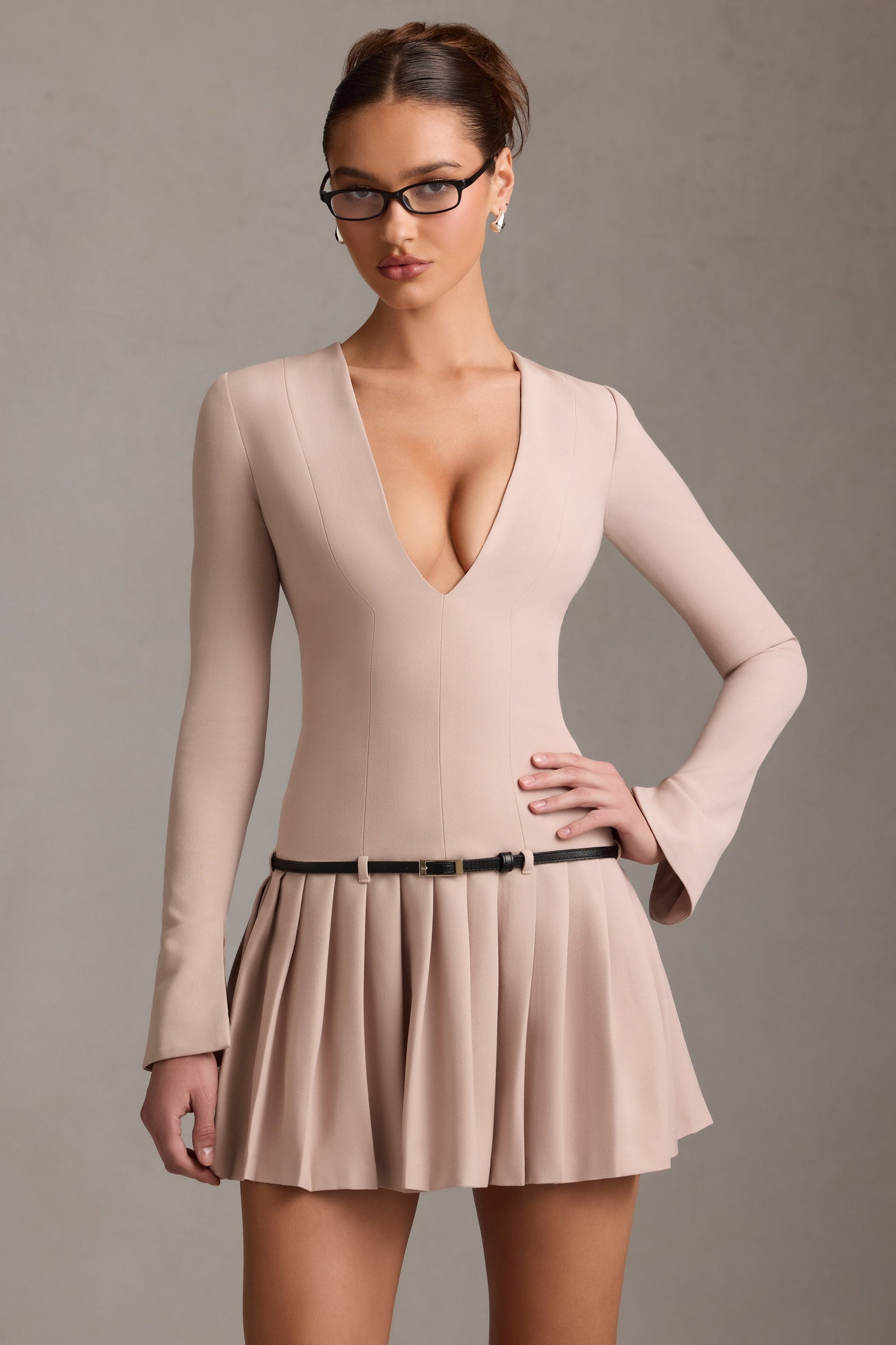 Long-Sleeve Pleated Mini Dress in Mushroom