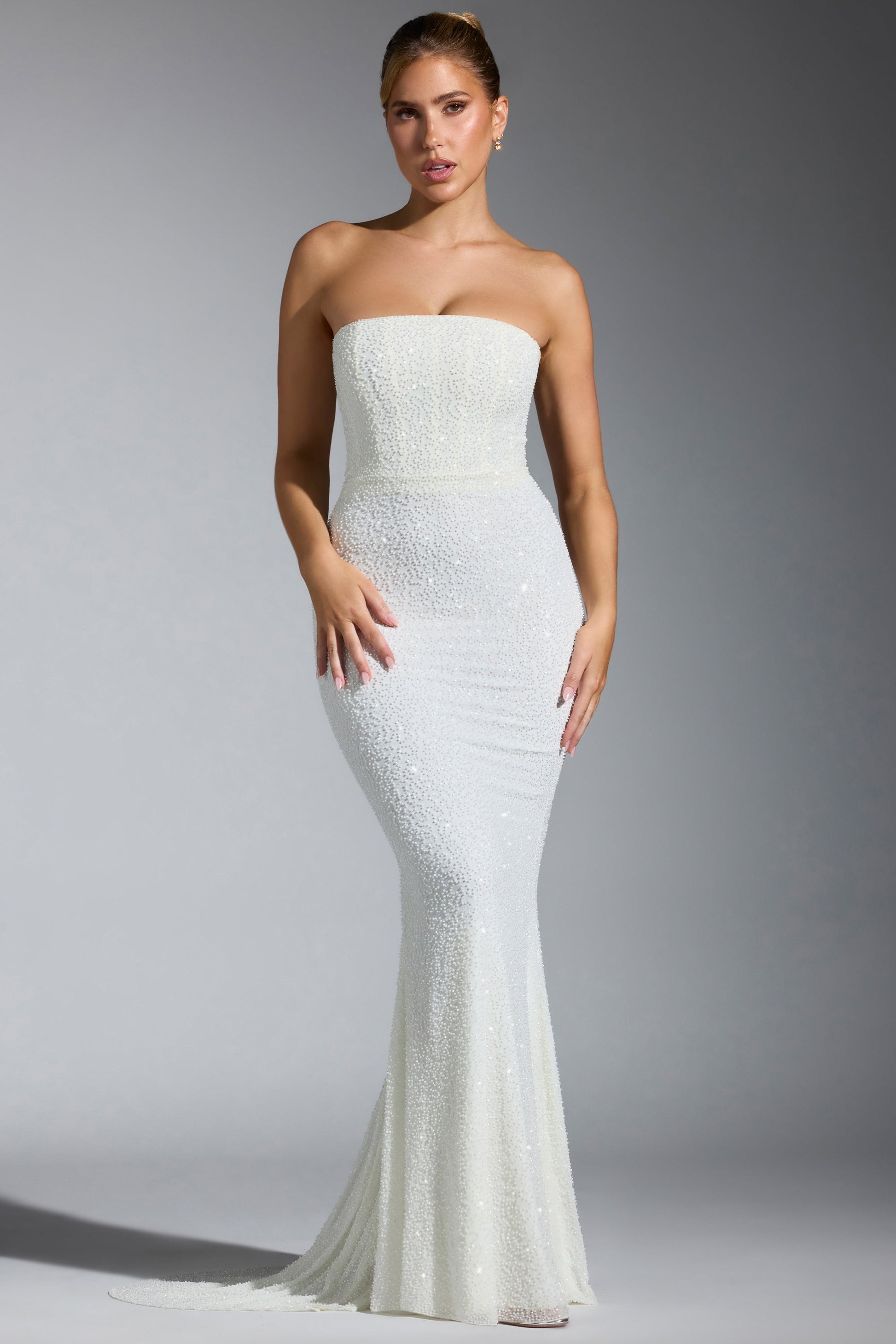 Couture-inspired looks with a signature Oh Polly touch. Crafted from our premium 20D hand-embellished mesh fabric with a soft jersey underlay that sculpts to your figure, the Florentina gown is a stunning design made for memorable occasions: think galas and evening receptions. It features a concealed boned corset for enhanced sculpting and falls to a fluid skirt with a godet fishtail train.