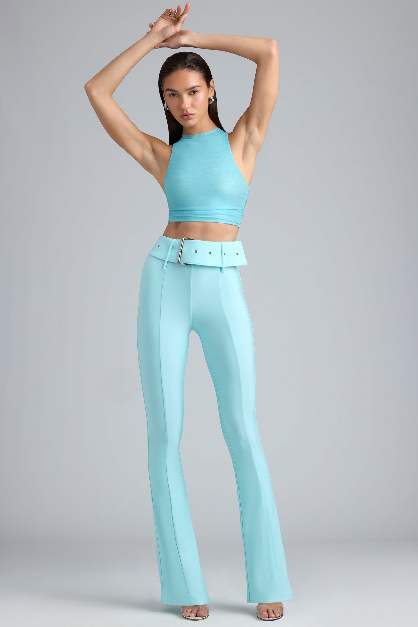 Tall Metallic Belted Mid-Rise Flared Trousers in Ice Blue