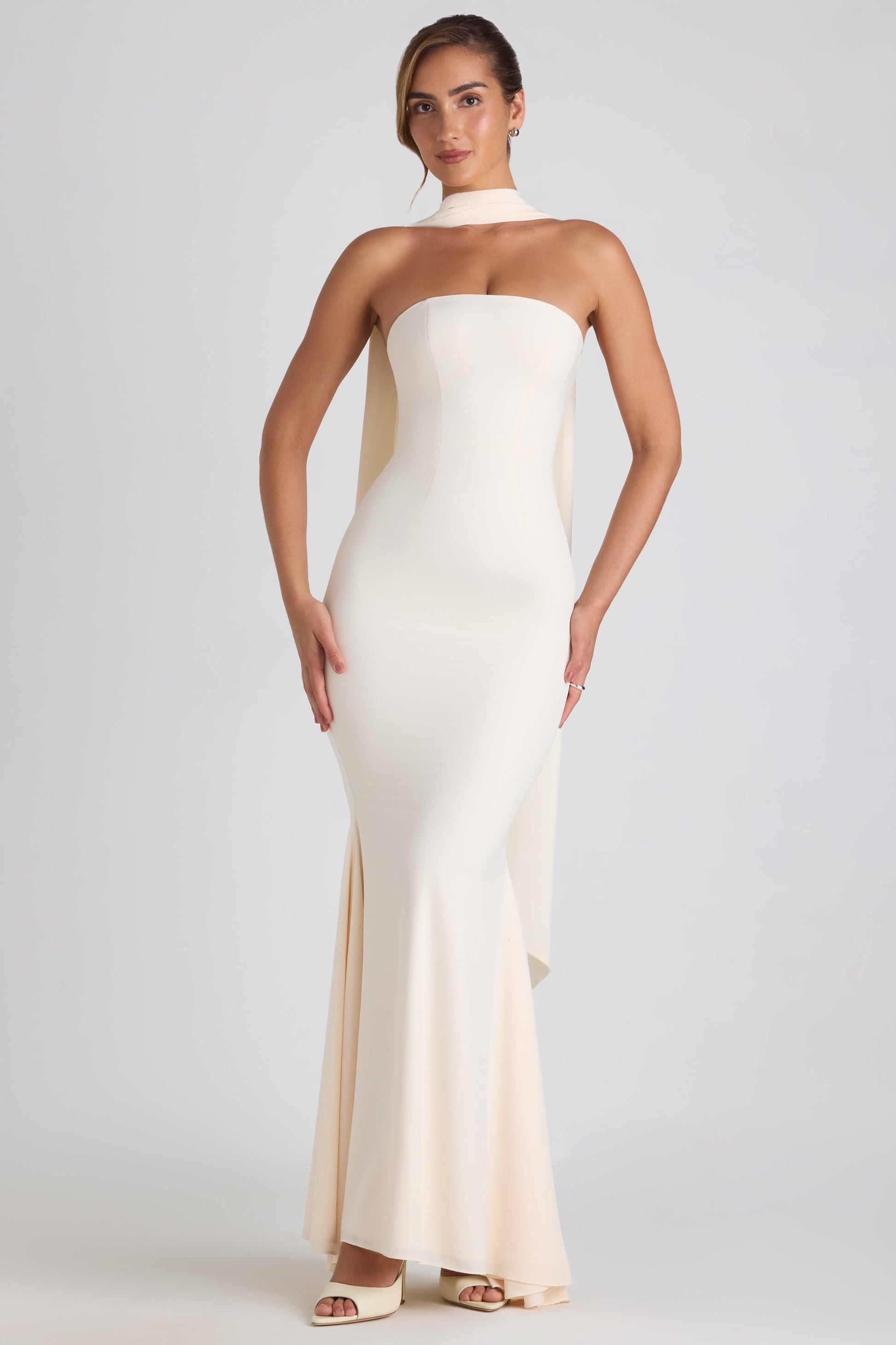 A forever classic. Designed to be worn at galas or memorable receptions, the Imogene gown is crafted from lightweight georgette that skims your curves and features a stunning fishtail skirt that creates the illusion of a structured hourglass shape. It��s finished with a bandeau neckline, secured with silicone taping, and comes complete with a coordinating scarf that can be styled to create multiple looks.