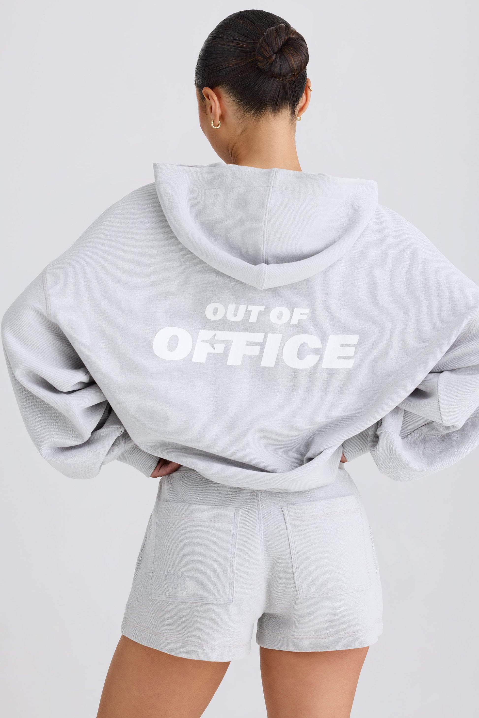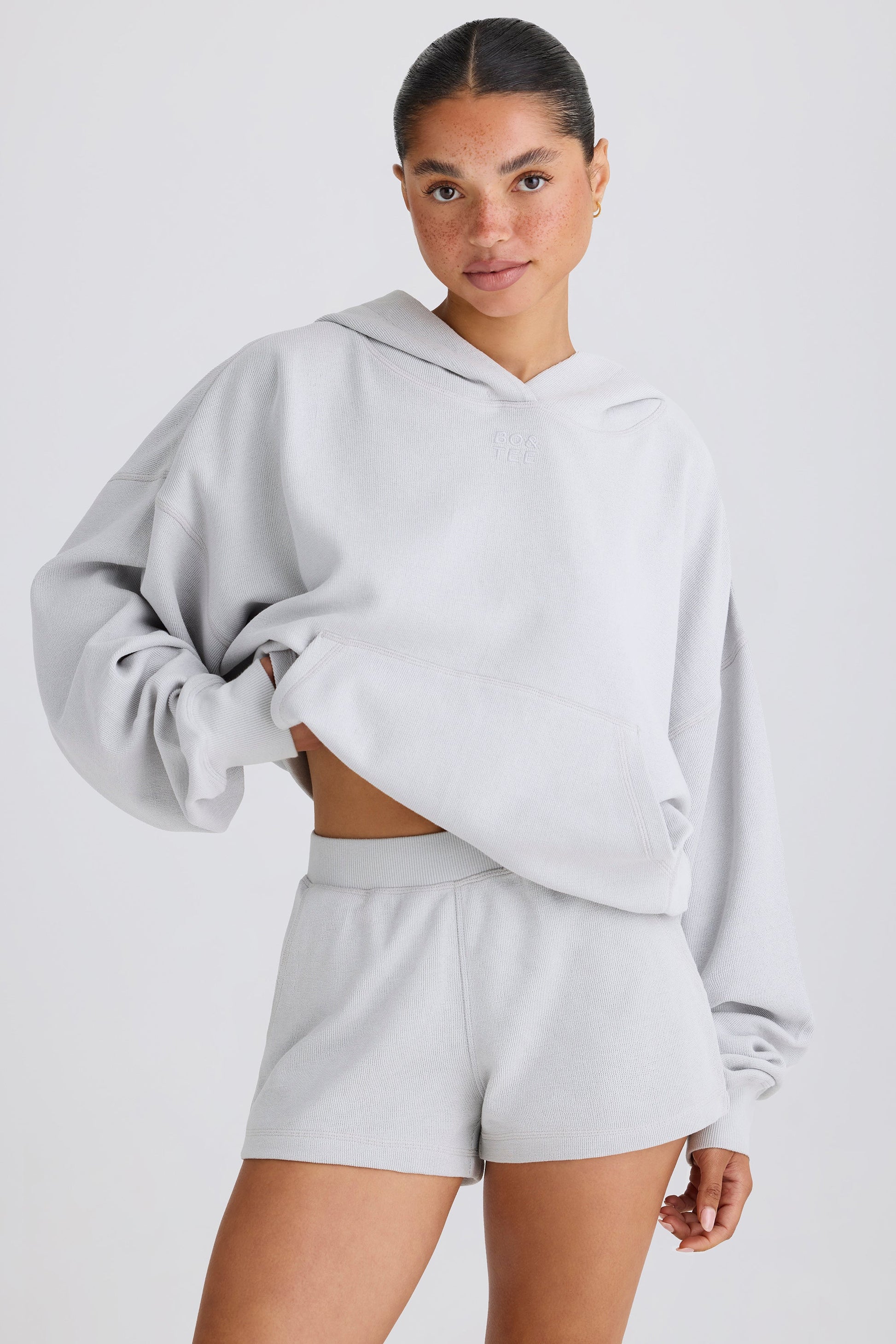On-the-go summer styling. Ideal for airport days or chilled evenings at the beach, these shorts are crafted from lightweight, textured cotton jersey with a touch of stretch for enhanced comfort. They��re set on an elasticated ribbed waistband and are finished with two patch pockets at the back �C one is embroidered with a tonal Bo&Tee logo for a signature touch.