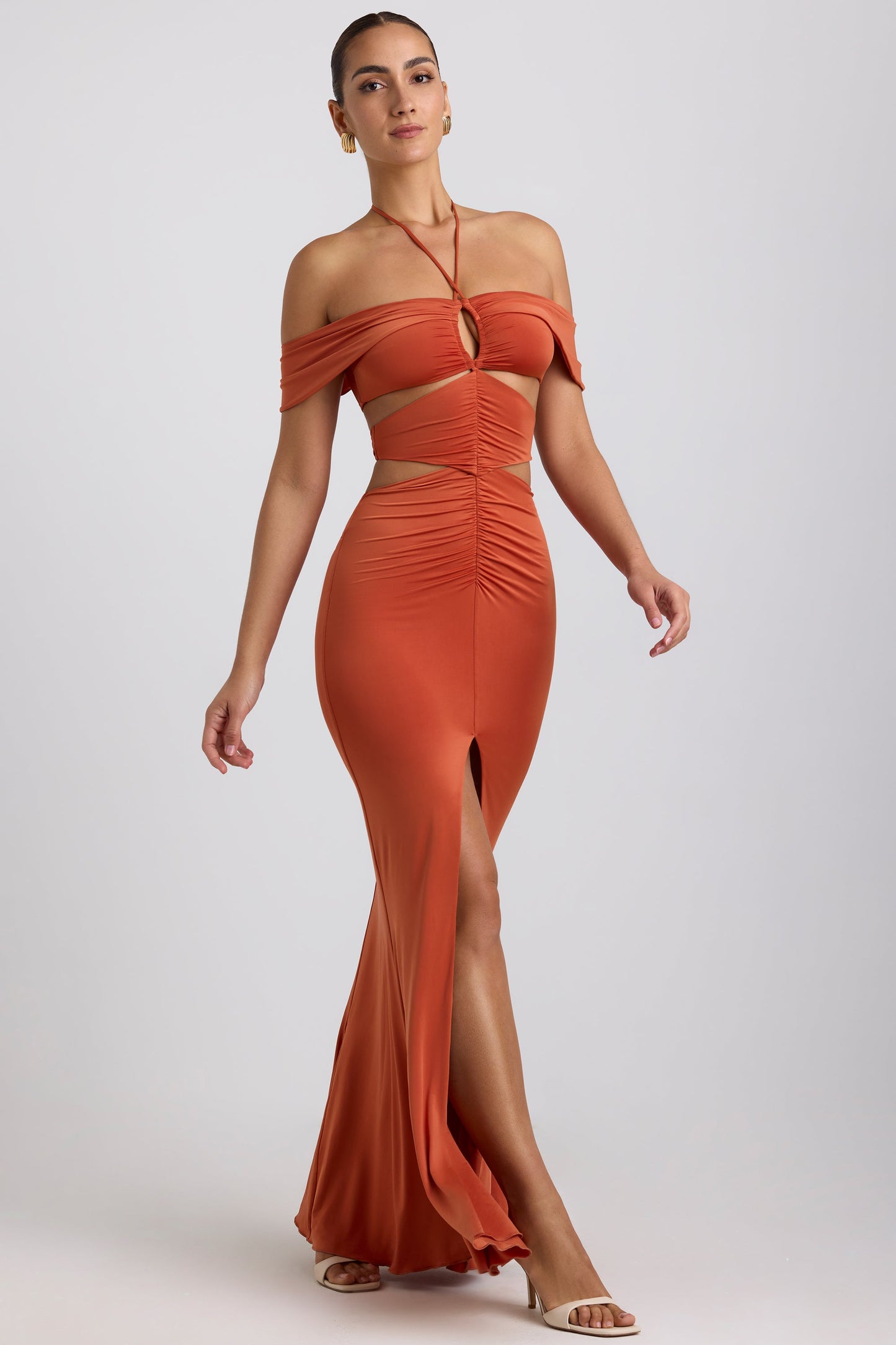 Slinky Jersey Cut-Out Halterneck Gown in Burnt Orange