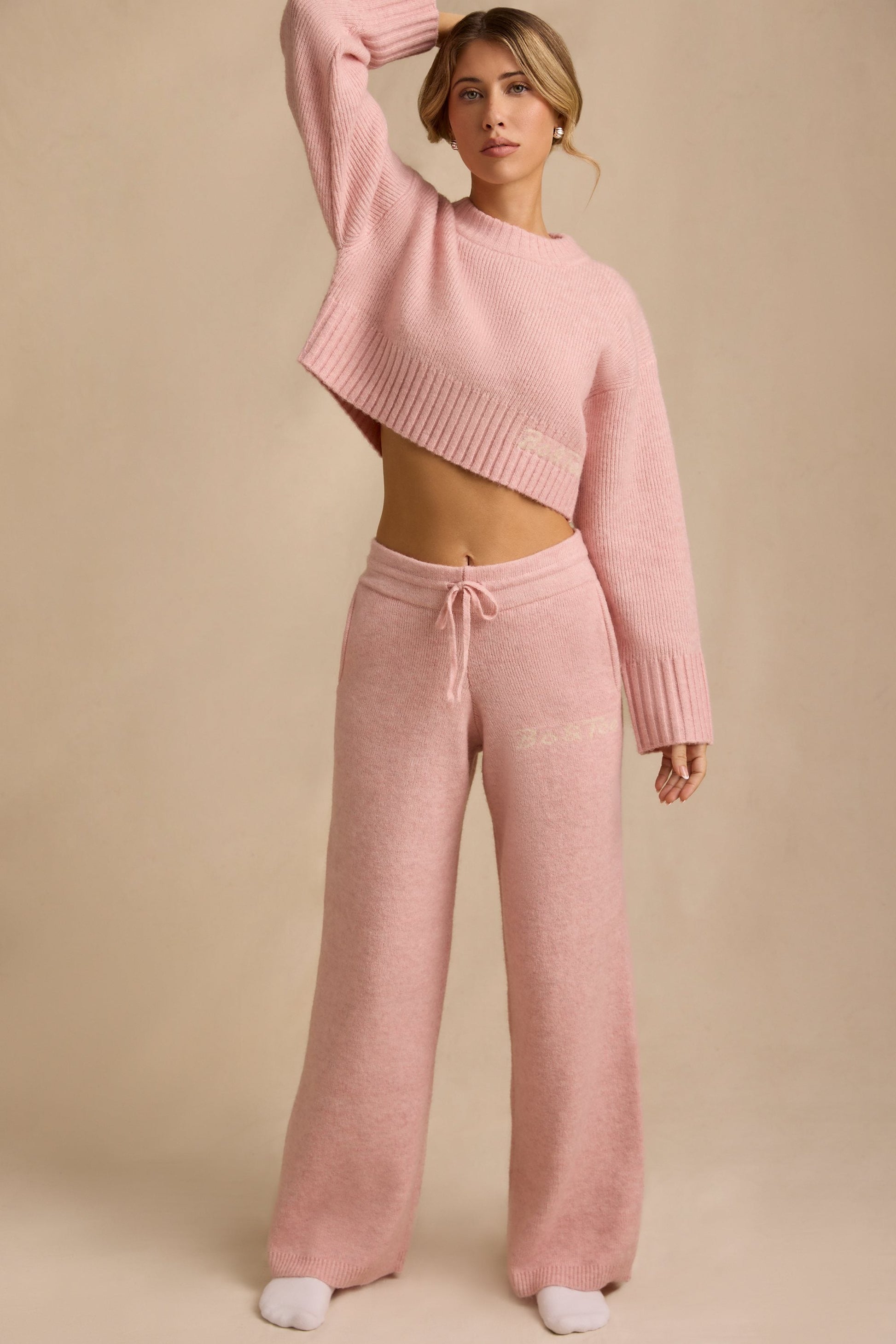 A style you��ll live in, these joggers are crafted from our super soft and sumptuous ribbed-knit fabric, made with recycled materials, to a slouchy wide-leg silhouette. They��re set on a mid-rise elasticated waistband for enhanced comfort and feature a drawstring for a customisable fit. The knitted Bo&Tee logo is a signature found on the coordinating cardigan from the collection.