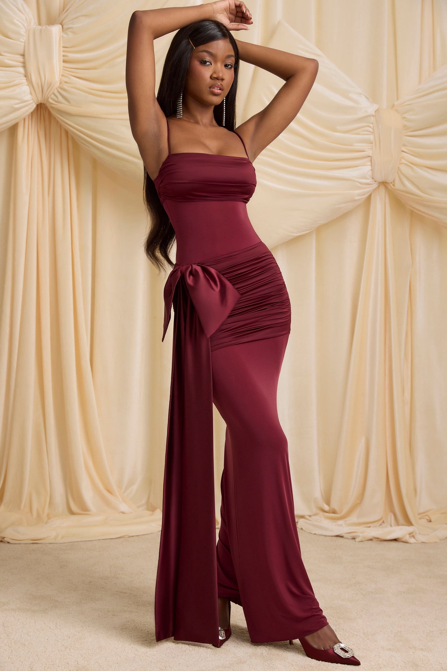 Bow-Detail Ruched Maxi Dress in Wine Red