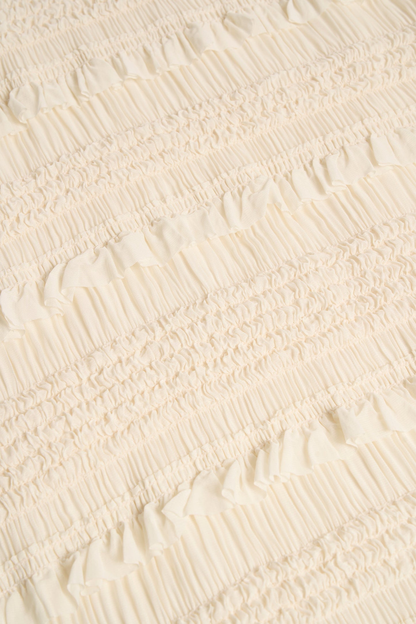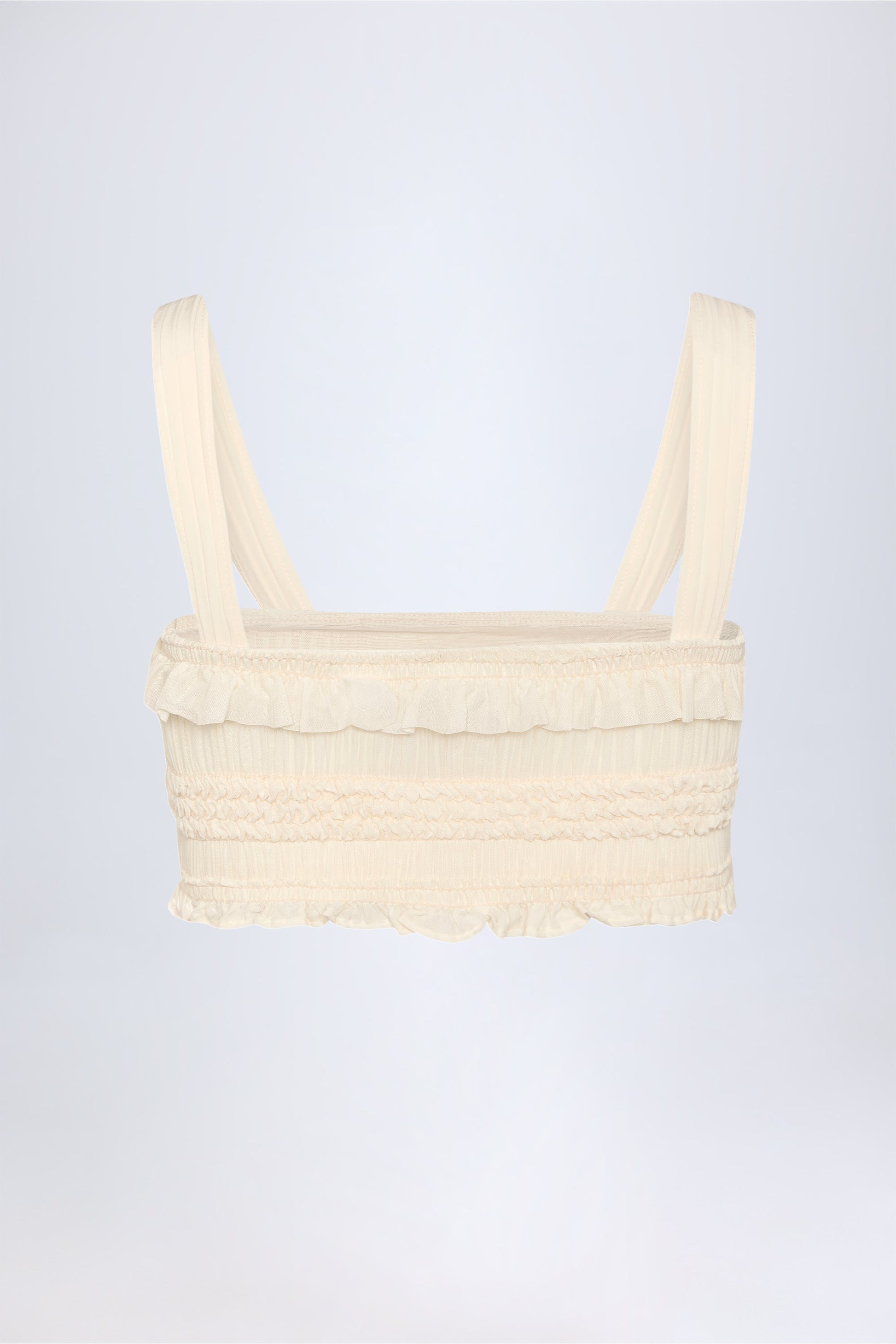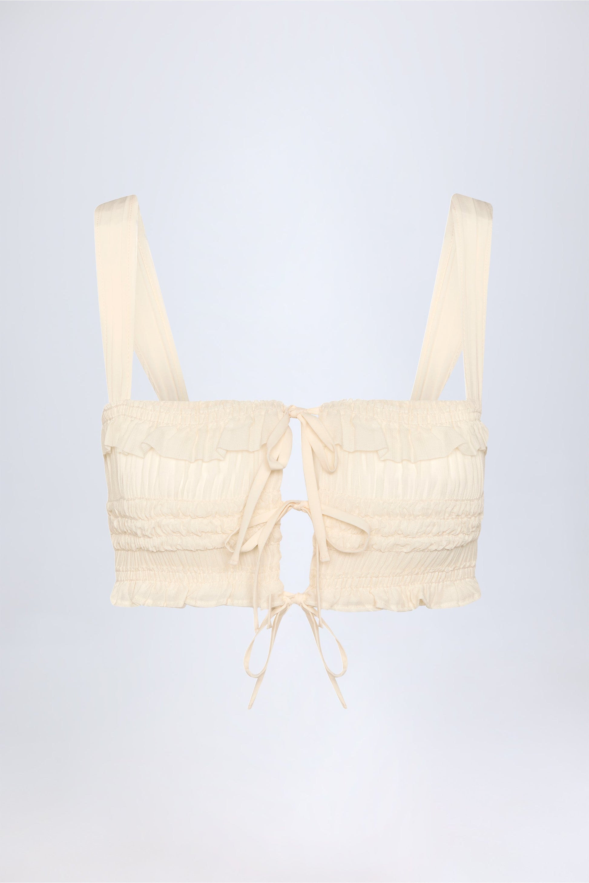 Sweet summer styling. Designed to coordinate with the matching shorts for the perfect festival look, the Ottilie crop top is crafted from our custom-designed textured mesh, elevated with cutesy ruffled trims. It features an open front secured with a trio of functional ties and is framed with tapered pleated shoulder straps.