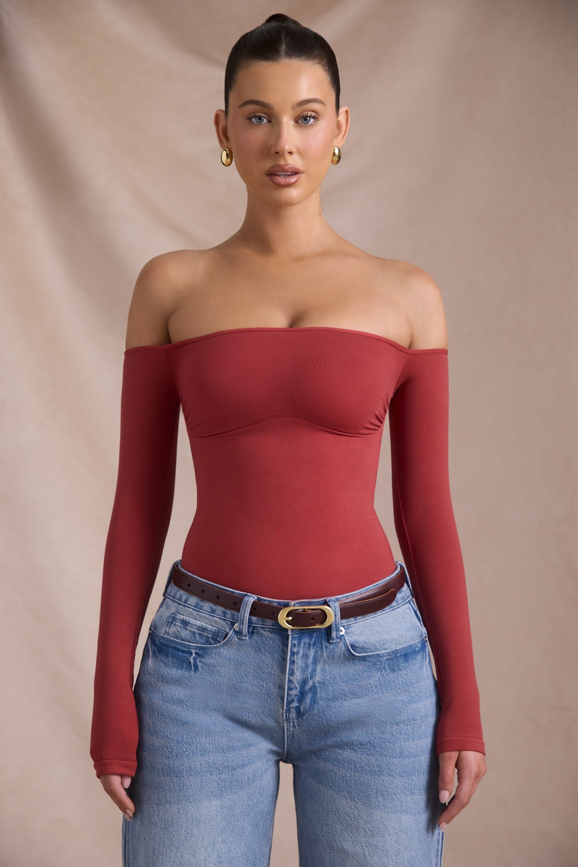 Seamless Off-Shoulder Long-Sleeve Bodysuit in Brick Red