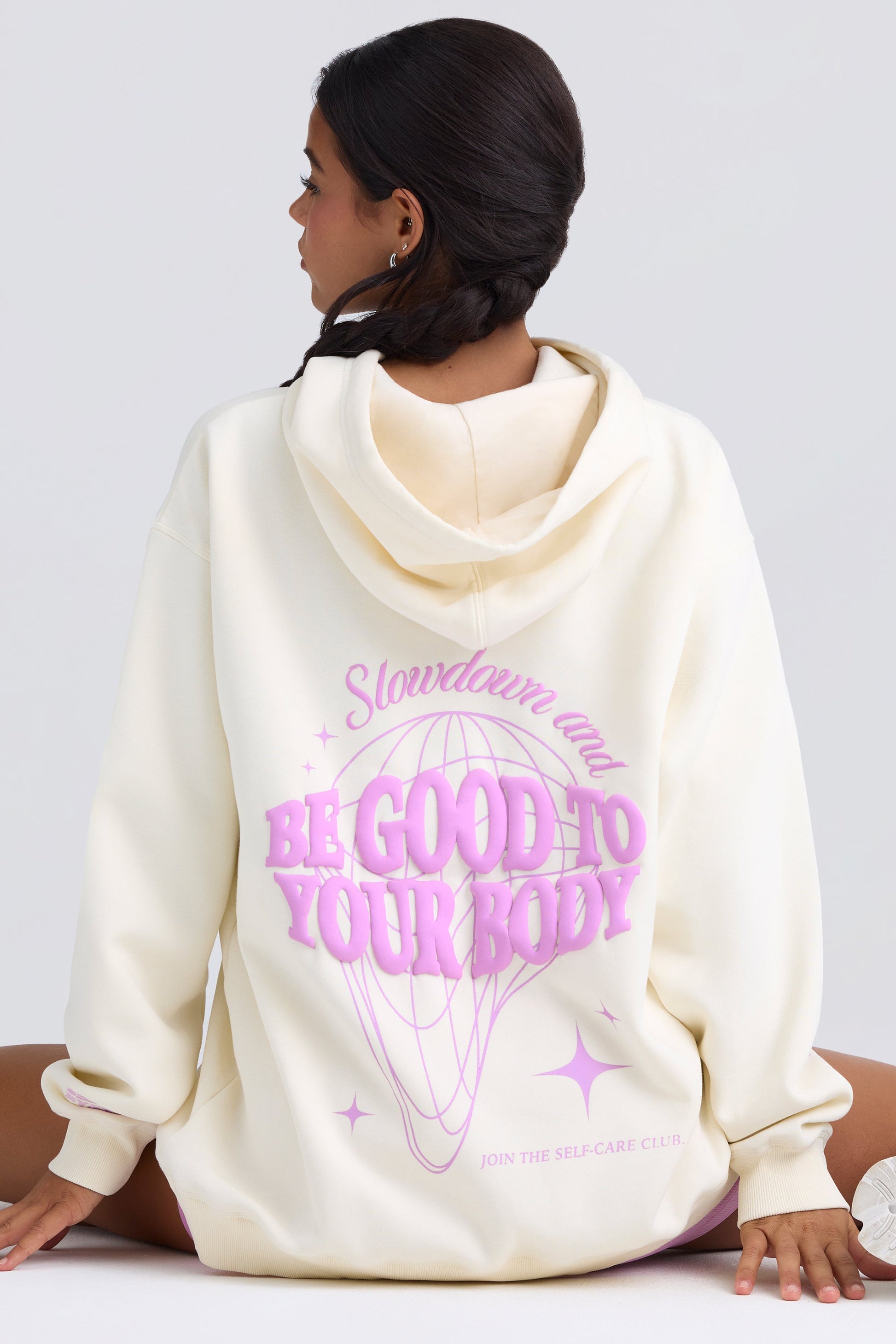 Morning mantras. A reminder to practice self-care every day, this hoodie is saturated with contrasting custom-developed graphics. It��s crafted from super soft, heavyweight fleece with a brushed finish and cut to a signature oversized fit with a ribbed hem and cuffs. It��s complete with an adjustable drawstring hood and kangaroo pocket.