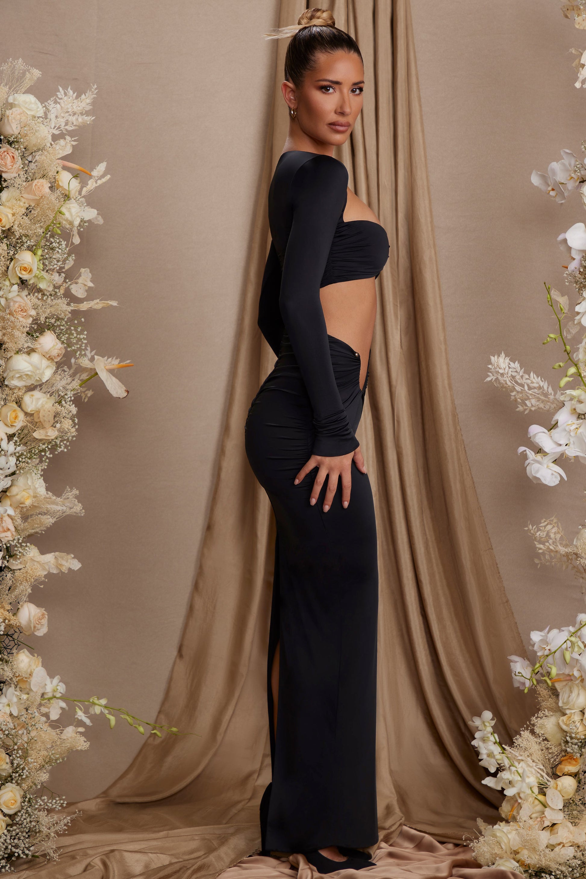 Figure hugging and cut from our slinky jersey fabric, the Tiani maxi skirt is a staple piece for creating a glamorous evening wardrobe. Designed with ruching at the hips that accentuates your curves, Tiani is complete with a statement angled cut out, shaped with metal hardware that? adds an edge to this romantic design. Perfect for creating an evening look that's sensual and scene stealing, the Tiani maxi skirt is a must have style this season.