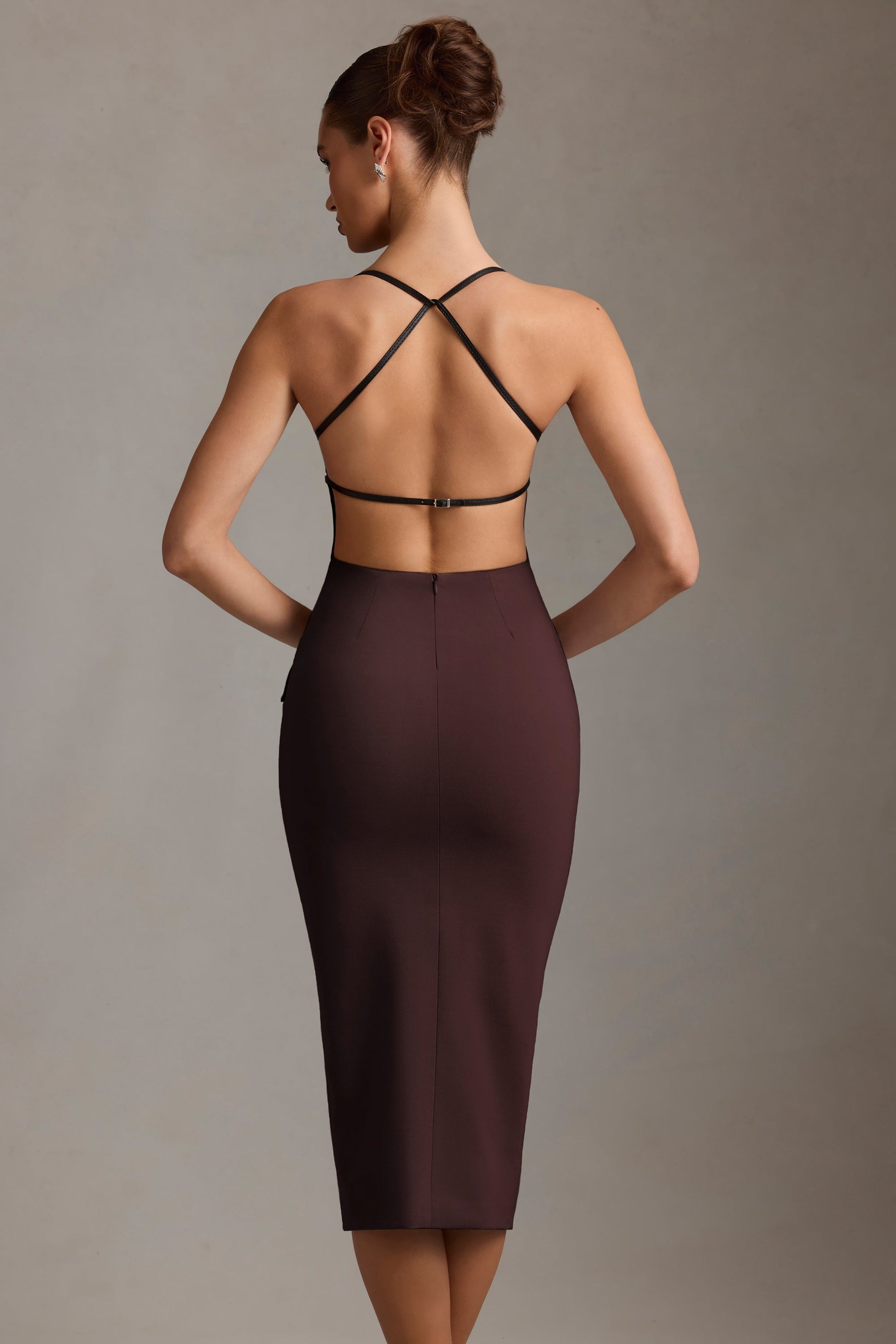 Plunge-Neck Backless Midaxi Dress in Chocolate Brown